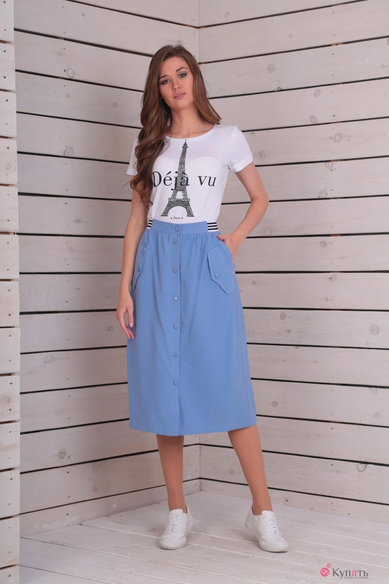 Комплект: юбка+футболка. Силуэт: расклешённый. Вид застежки: кнопки на юбке. Вырез горловины: округлый.