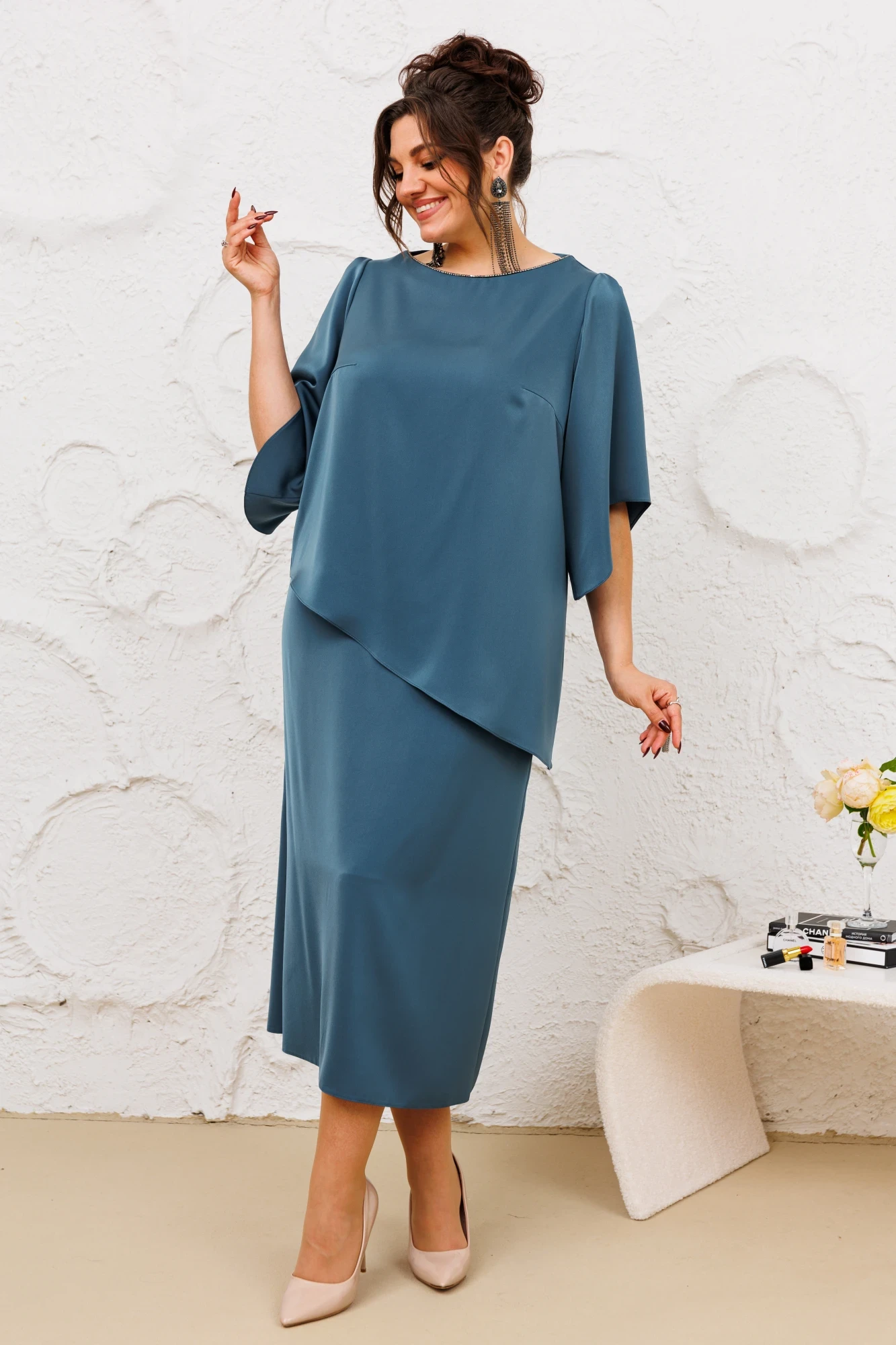 Длина юбки по боковому срез 87 см. Длина спинки блузона 67 см, длина рукава 34 см.