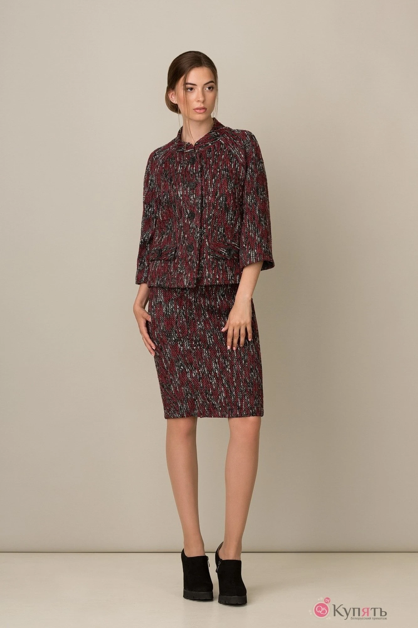 Комплект из мягкой пальтовой ткани на подкладке, состоящий из жакета и юбки. Жакет прямого силуэта с двумя нагрудными вытачками и двумя прорезными карманами с клапанами. Воротник -стойка. Рукав трехчетвертной. Жакет застегивается на 4 пуговицы. Юбка на подкладке, слегка зауженная к низу, с поясом. В рельефах юбки расположены карманы. В среднем шве заднего полотнища юбки - застежка-молния и шлица.