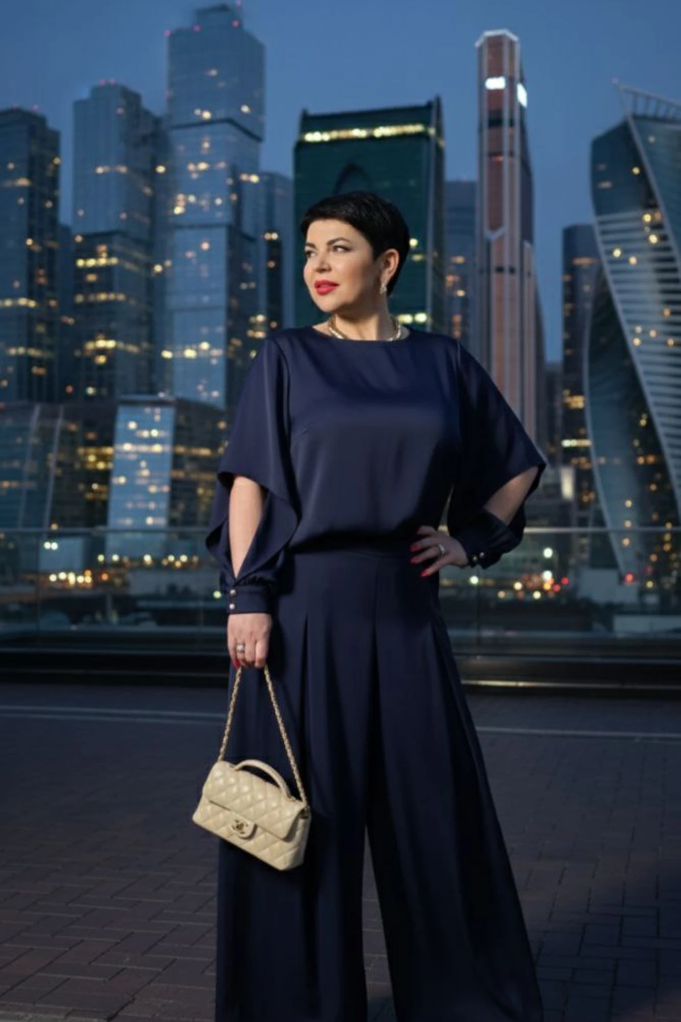 Длина блузки от высшей точки плечевого шва до низа 60 см (р 50-54), 61 см (р 56-60). Длина рукава 61 см (р 50-54), 62 см (р 56-60). Длина брюк по боковому шву от шва притачивания пояса 93 см (р 50-54), 94 см (р 56-60).