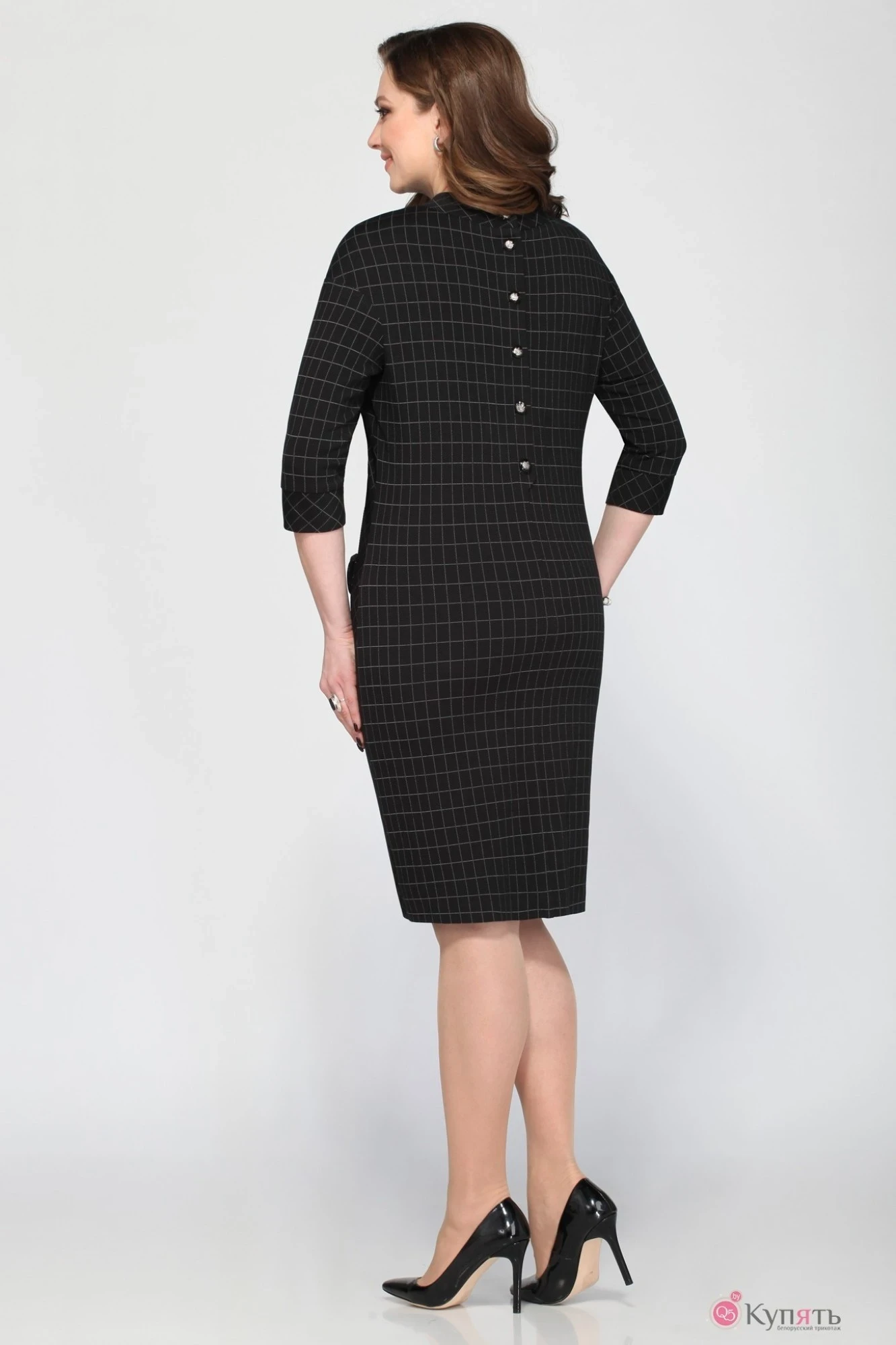 Платье женское прямого силуэта, выполнено из трикотажной ткани. Воротник "стойка" в широкой горловине слегка отходит от шеи. Узкие отрезные бочки по полочке, накладные карманы с клапанами и манжеты рукавов, выкроенные по косой, создают интересную игру клетки. Нагрудные вытачки двойные: из пройм и боковых швов. Линия плеча низко спущена. Рукав втачной, одношовный 3/4, с широкой отрезной манжетой. Застежка на спинке в среднем шве на петли-пуговицы.
