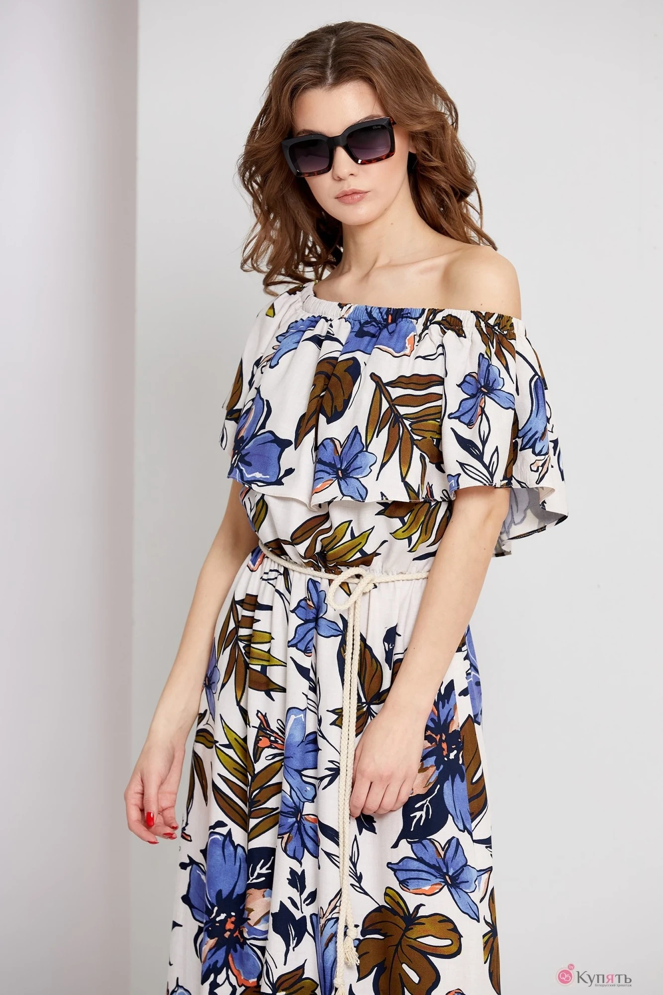 Платье выполнено из ткани с цветочным принтом. Горловина присобрана на резинку, по линии талии также вставлена резинка. Пояс из витой тесьмы идет в комплекте.