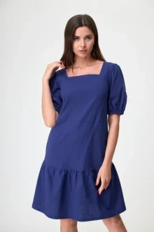 Длина до середины колена придает ему элегантность, а волан на низу платья добавляет легкости движениям. Рукав 3/4 с собранными деталями и эластичным низом придают образу непринужденную изысканность.