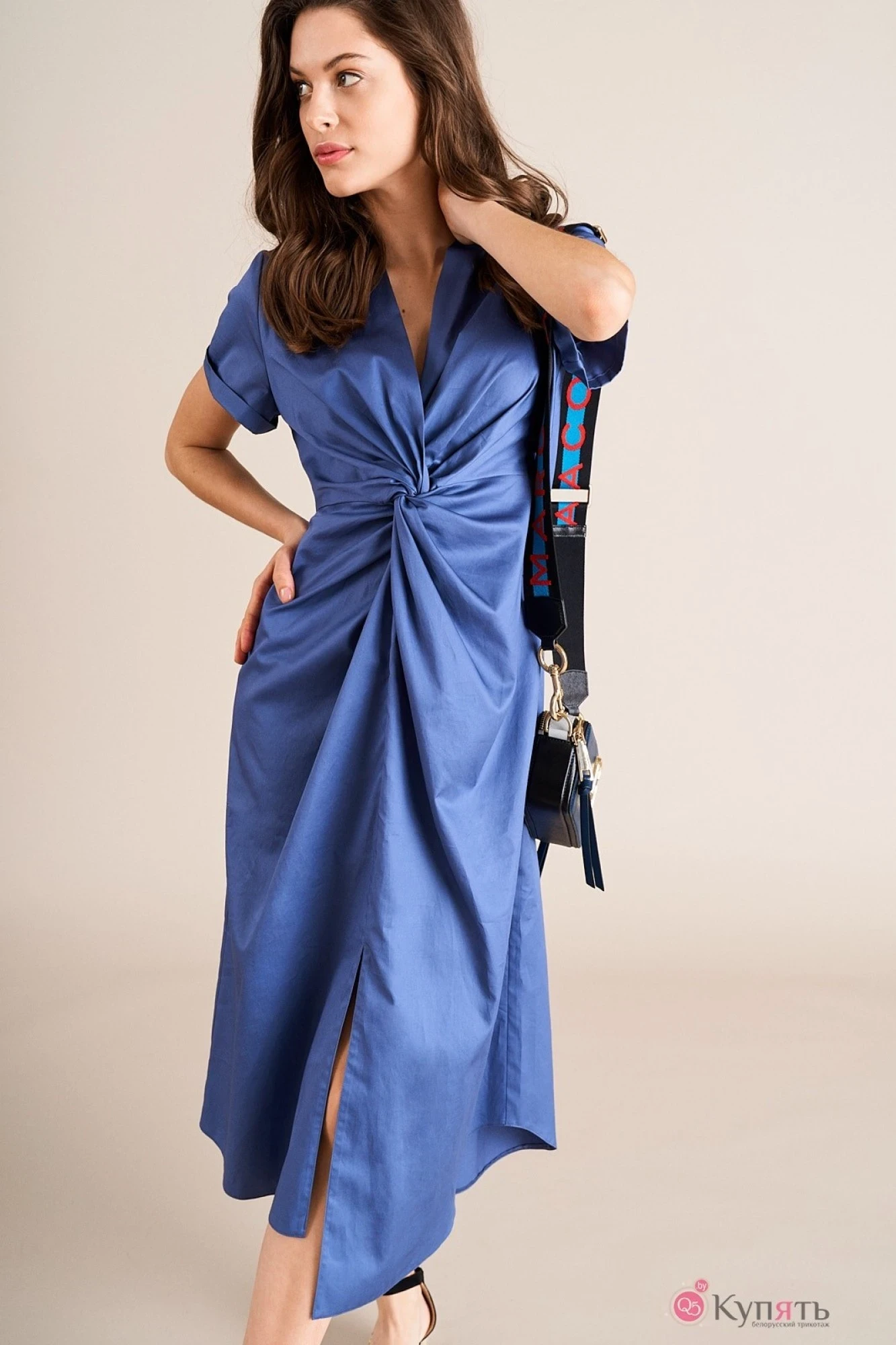 Платье женское из плательной ткани свободного кроя с подрезом по линии груди переходящий в узел на запах. Нижняя часть переда платья из двух частей. Рукав втачной, одношовный. Без застежки. Длина изделия 118 по спинке, длина рукава 14.