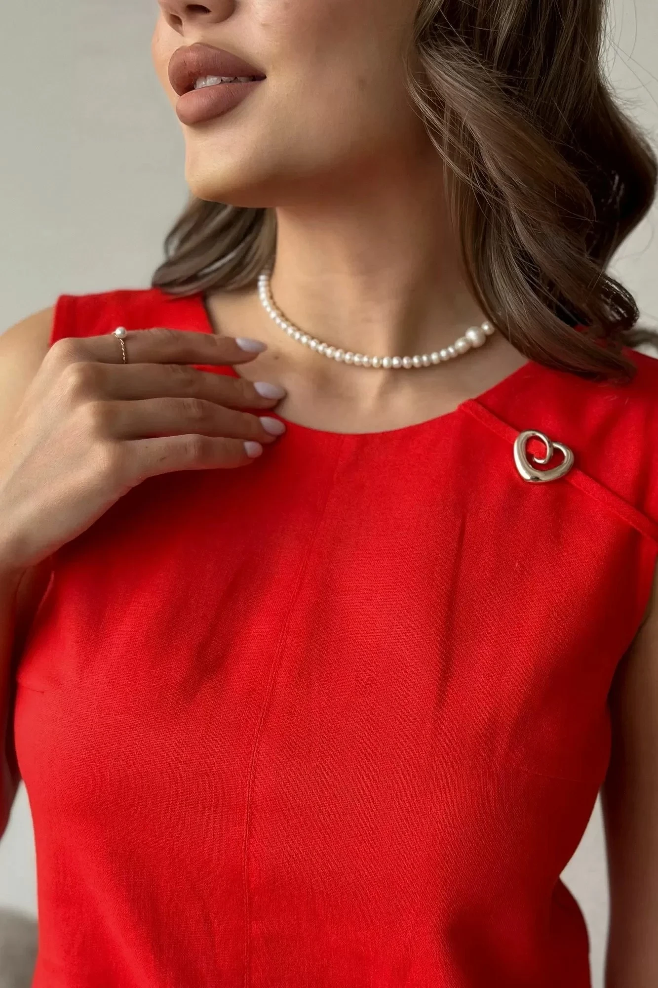 Перед с нагрудными вытачками из бокового шва, средним швом, в котором по низу обработан разрез. Вырез горловины округлой формы. В левую часть горловины и проймы вставлена отделочная деталь с декором-«сердце».