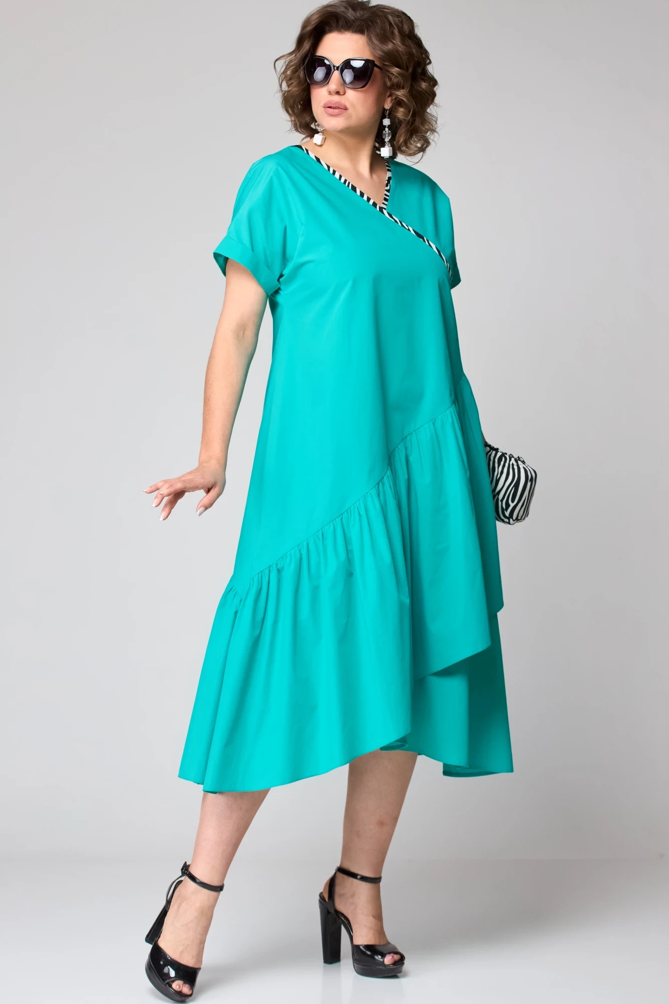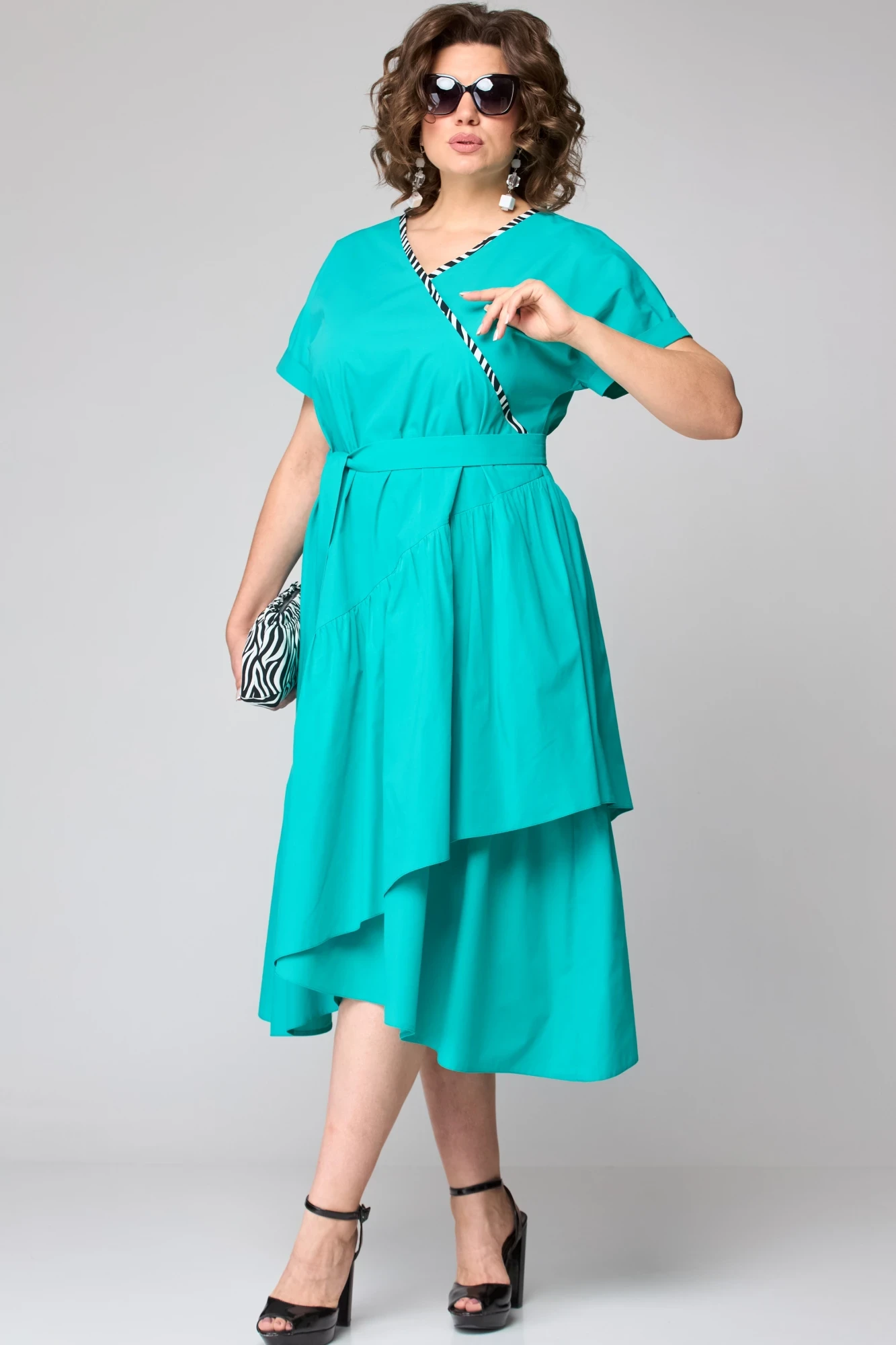 Платье яркого бирюзового цвета как на фото, длинное миди для моего невысокого роста, на свой 48 размер заказала 50, так как в составе ткани хлопок и после нескольких стирок немного подсядет, а в общем соответствует размеру, фасон позволяет носить как с поясом, так и без него, смотрится очень женственно и не полнит, воланы по низу подола, красивое