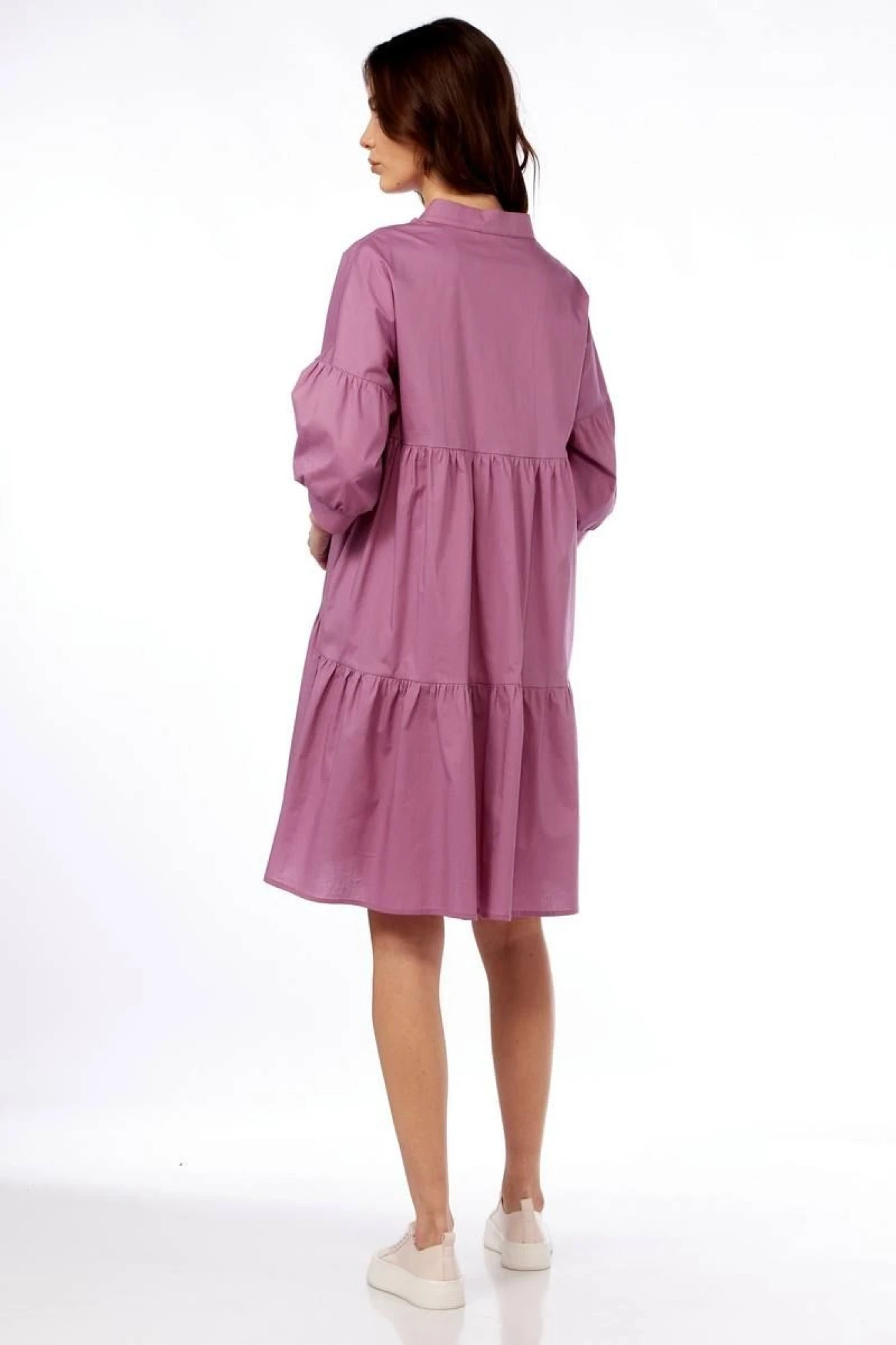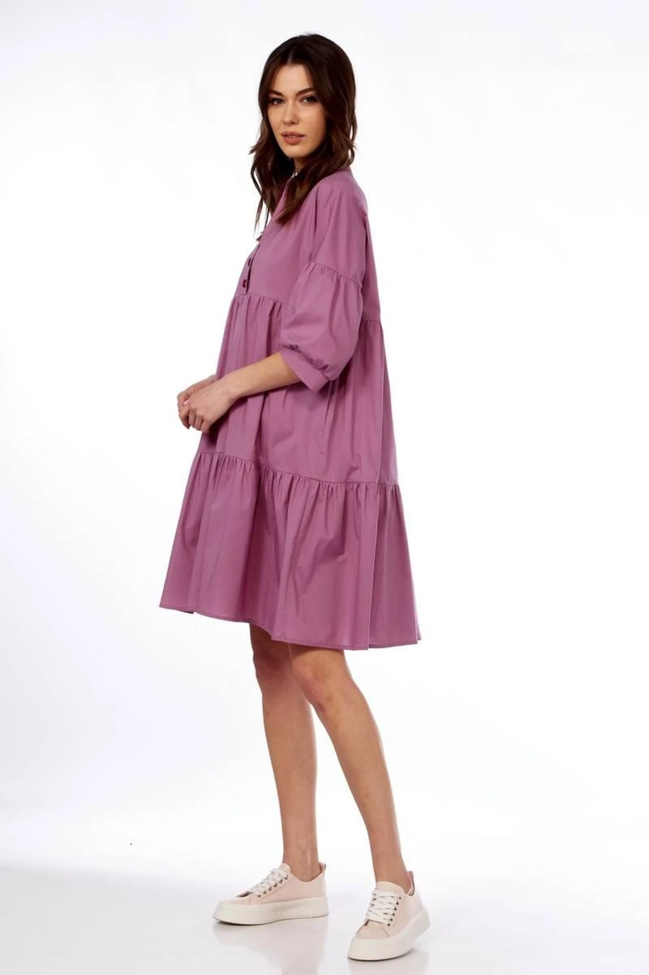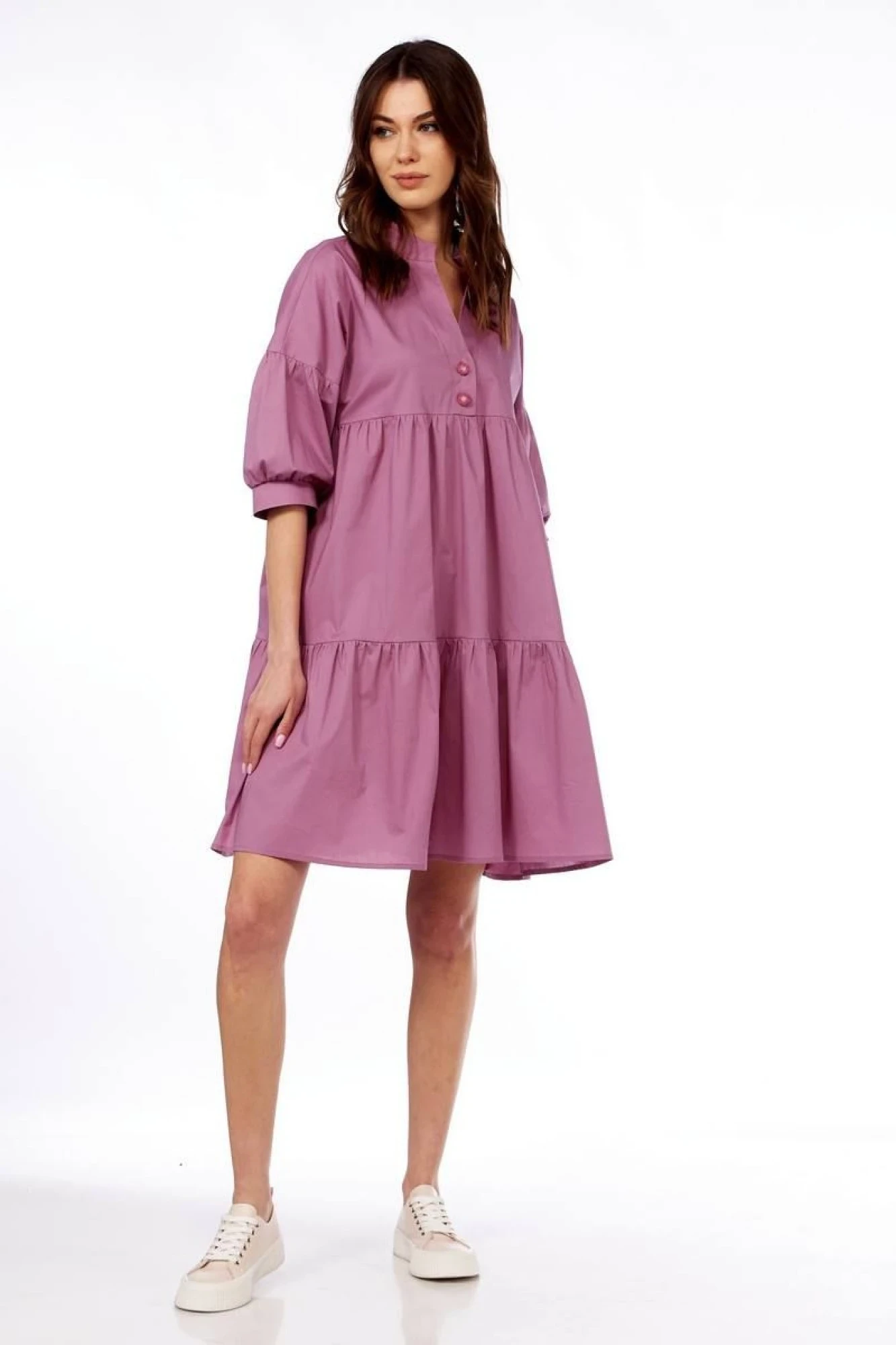 50,52,54В верхней части переда отделочная планка. Горловина со стойкой. Плечо спущенное, рукав с мелкой сборкой в верхней и нижней части с приталенной манжетой.