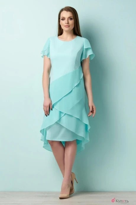 Элегантное женское платье полуприлегающего силуэта из сочетания лёгкой плательной ткани “Ниагара” и струящегося шифона . Лиф переда и лиф спинки оформлены полурельефами от проймы. Вырез платья круглый, неглубокий. Спинка со средним швом, заканчивающимся разрезом. Изюминка платья - лёгкие шифоновые слои в диагональном подрезе, окружающие по спирали фигуру. Рукав втачной, одношовный на запах из шифона.