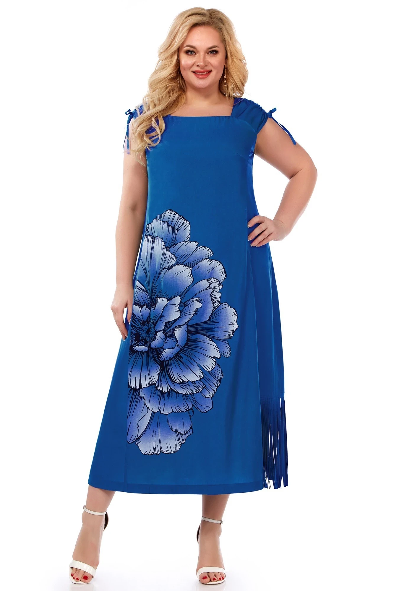 52, 54 ,56Удлиненное платье, расширенное к низу, выполнено из легкой непрозрачной ткани с шелковистым эффектом. Впереди оригинальная дизайнерская печать в виде роскошного цветка, рельефы и нагрудные вытачки. По спинке – рельефы и застежка «молния» по центру. Внизу с левой стороны подрез и модный декор в виде бахромы. Рукав короткий, на основе реглана, по центру кулиска со шнуром, создающая мягкую драпировку.