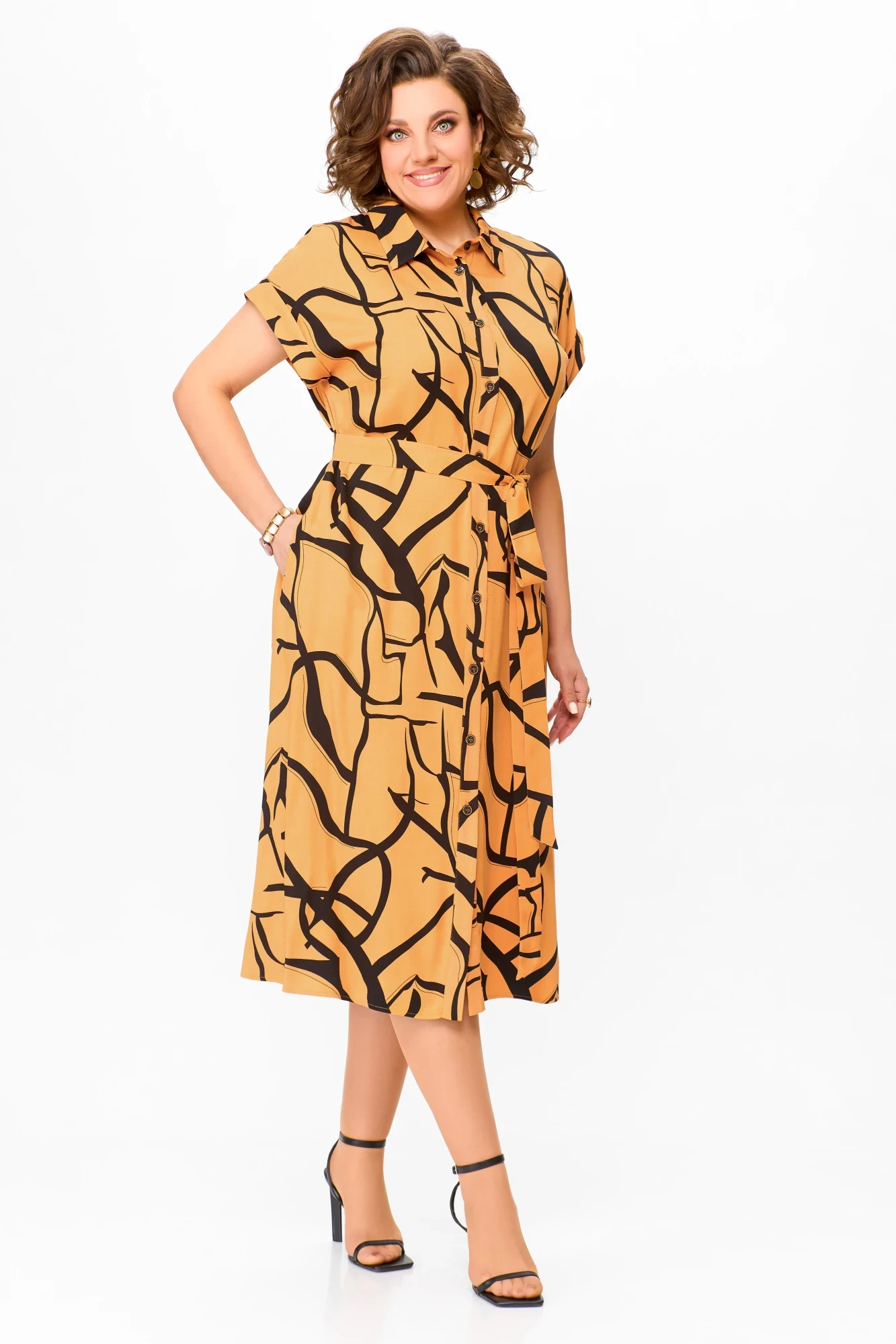 Платье из вискозы Swallow 740 cветло-оранжевый+чёрный принт абстракция