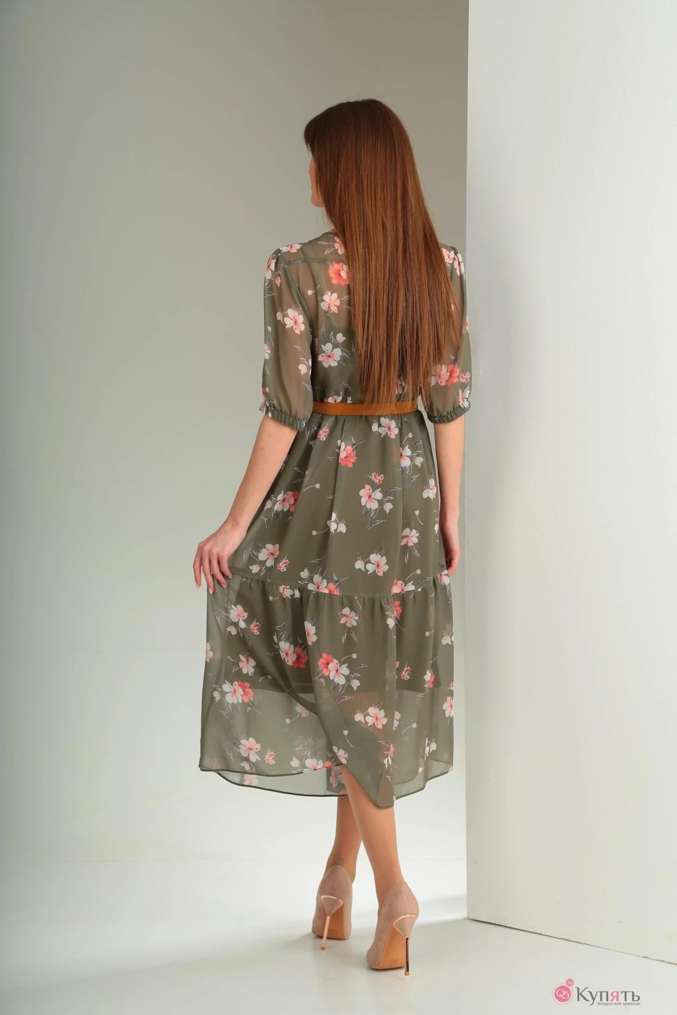Платье женское нарядное свободного покроя, отрезное по линии талии, присобрано на эластичную тесьму, из плательной ткани(шифон). По лифу переда по центру 3 складки; нагрудная вытачка переведена в горловину в виде складки. По лифу спинки кокетка, в среднем шве застёжка на петлю-пуговицу; по линии притачивания к кокетке – сборка по центру. Низ переда и спинки с отрезным воланом по низу; по талии складки. Рукав втачной ¾ со сборкой по окату, низ присобран на широкую эластичную тесьму(2,5 см). Горловина округлой формы, обработана обтачкой по переду, по спинке окантована. Изделие на подкладке(отдельное платье на бретелях, длина по средней линии спинки – 105 см).
