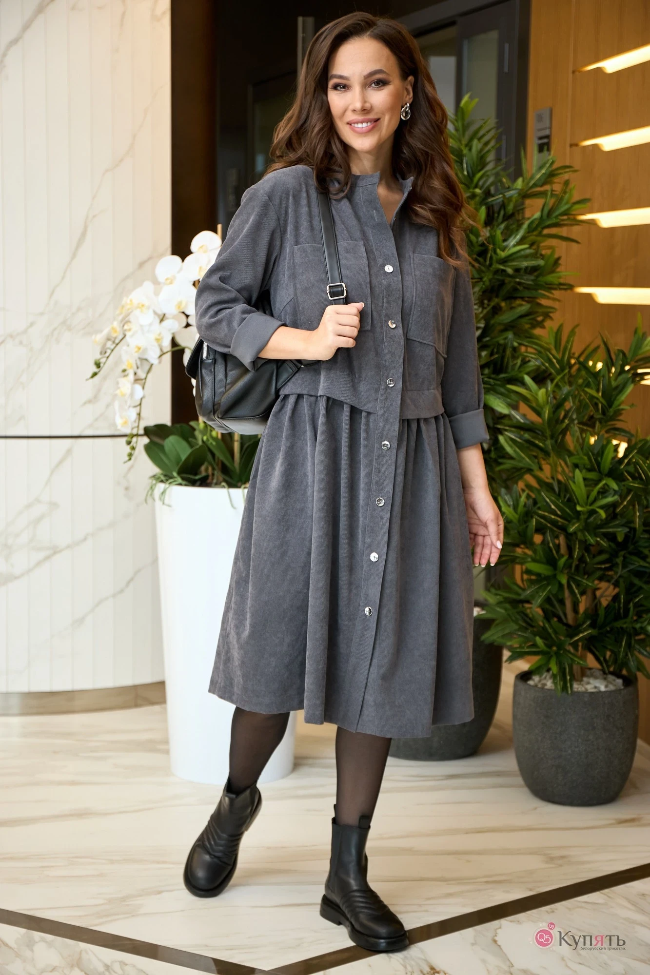 Платье прямого силуэта, длиной за колено, выполнено из вельвета в мелкий рубчик. Полочка платья с отрезной планкой по центру и застежкой на петли и пуговицы. Лиф платья отрезной, со складкой по низу, к срезу которой притачана юбка со сборкой. Полочка лифа с нагрудными вытачками и накладными карманами. Горловина круглой формы обработана воротником-стойкой. Пройма углубленной формы с рукавом рубашечного типа, рукав длинный, одношовный. В боковых швах юбки обработаны карманы.