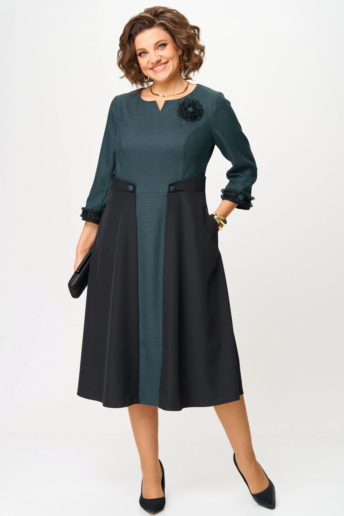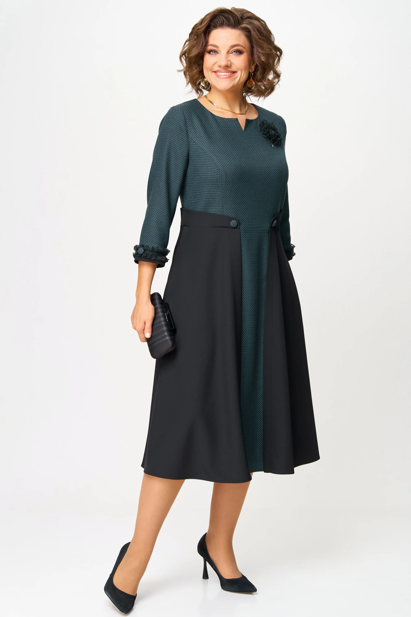 Платье полуприлегающего силуэта, отрезное по линии талии. Горловина с фигурным вырезом, обработана обтачкой. По переду лифа — рельефные швы. По спинке лифа талиевые вытачки и средний шов, в котором обработана потайная молния. Юбка платья ""клеш"", с вертикальной вставкой по переду и средним швом по спинке. Подрез по талии закрывается декоративным поясом с пуговицами. Добавят комфорта при носке функциональные карманы в боковых швах. Рукав втачной прямой, длиной ¾, по низу — манжет, декорированный тесьмой и пуговицой. В комплекте к платью прилагается съемное украшение из тесьмы.