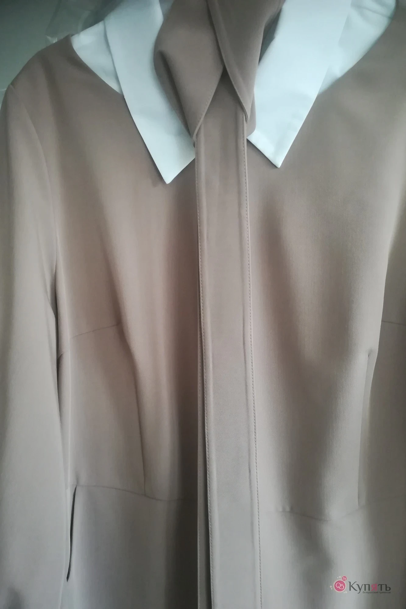 Платье женское делового стиля полуприлегающего силуэта, со съёмным воротником и съёмным поясом, разрезное по линии талии. Лиф переда с нагрудными и таллиевыми вытачками, по низу переда боковые карманы с фигурным входом. На обтачке расположены обмётанные 8 петель Спинка с потайной молнией и шлицей в среднем шве. Вытачки располагаются по лифу и по юбке спинки. Рукава втачные, длинные, одношовные с притачной манжетой, со сборкой по низу. Съёмный воротник стояче-отложной с притачными планками на манишке, застёгивающийся на 3 обмётанные петли и пуговицы. Низ манишки воротника обработан обтачкой, на которую пришиваются 8 пуговиц. Пояс из основной ткани.