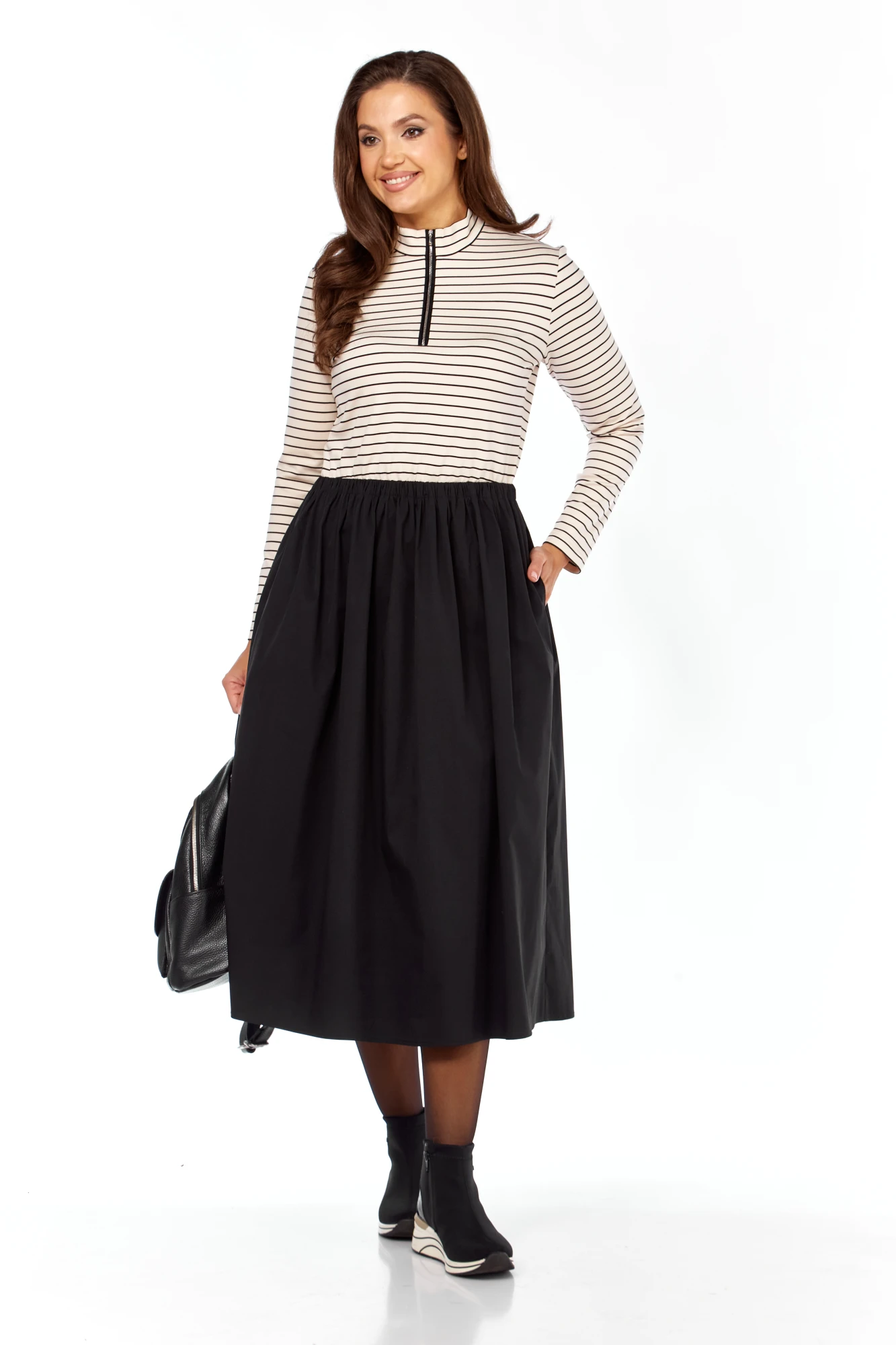 Верхняя часть платья выполнена из трикотажного полотна, с центральной застёжкой на металлическую тесьму-молнию.Спинка цельная.Рукава втачные длинные одношовные.Круглый вырез горловины обработан двойным притачным воротником-стойкой.