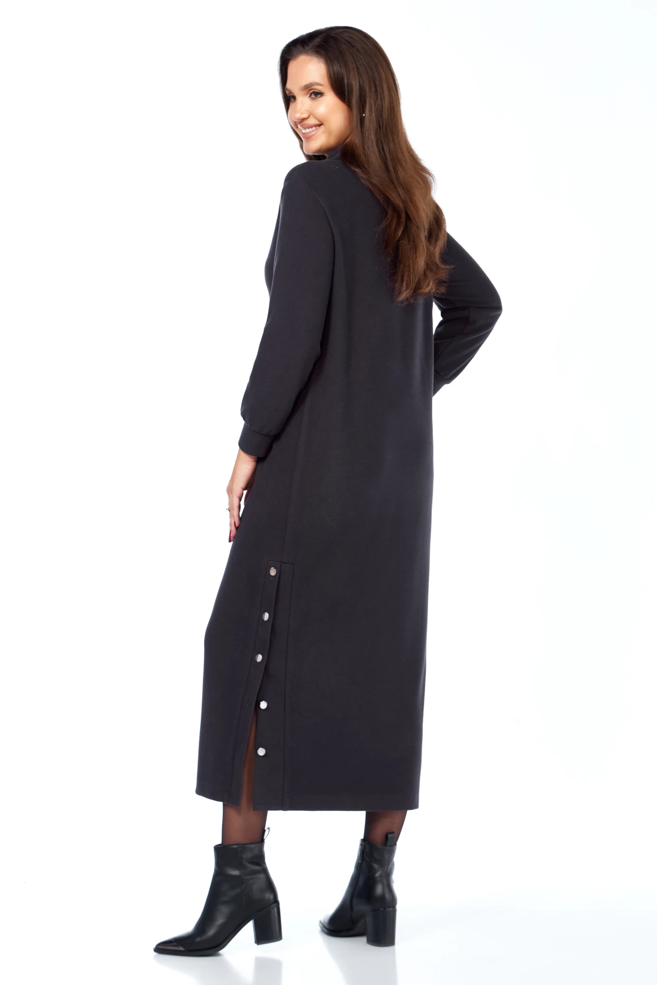 Платье с отложным воротником и планками с декоративной металлической пластинкой,без застёжки. Перед с накладными карманами. Слева вдоль бокового шва разрез ,оформленный планками и декоративной металлической пластинкой. Плечи слегка спущены. Рукава одношовные длинные,низ на двойных притачных манжетах.