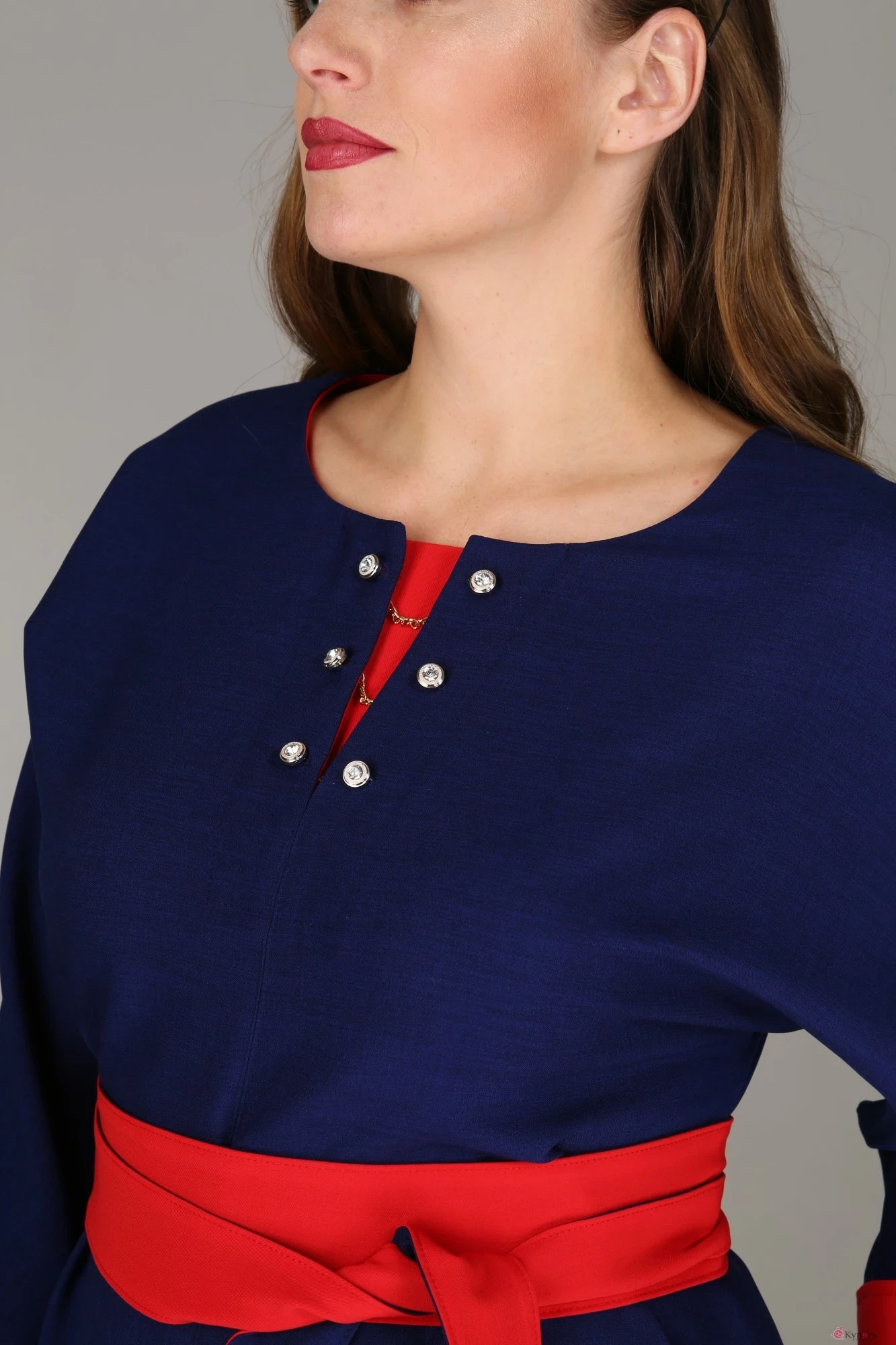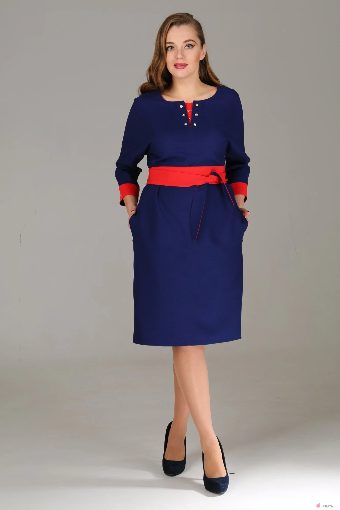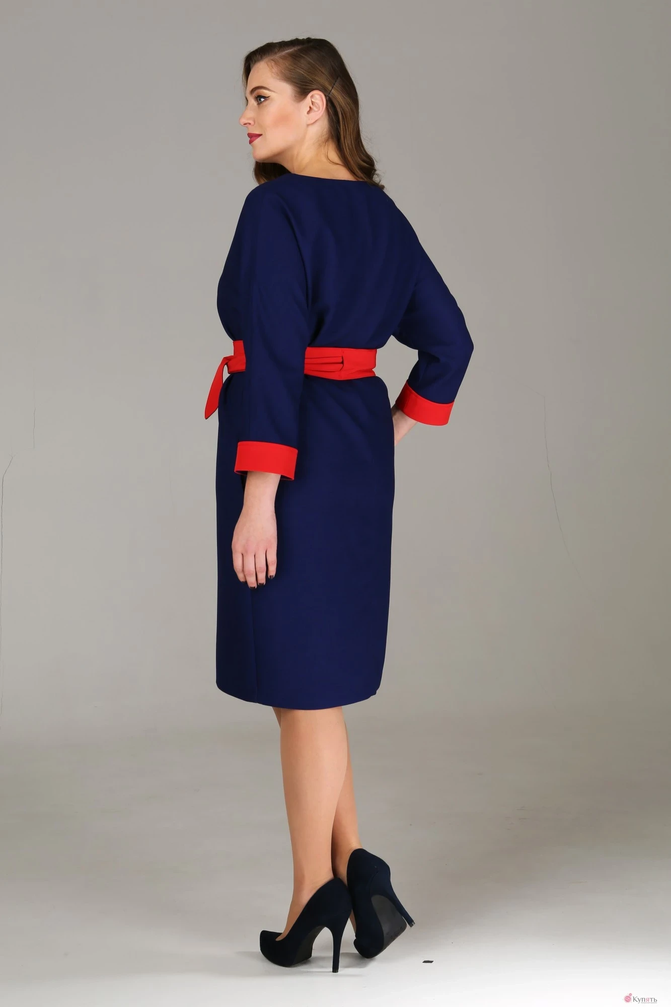 Стильное женское платье прямого силуэта с цельновыкроенным рукавом. Низ рукава оформлен манжетом из контрастной ткани. По переду центральный шов. Горловина круглая с планкой. В планке вставка из контрастной ткани, по планке пришиты декоративные пуговицы с цепочкой. Платье с поясом-кушак. Пояс выполнен в двух цветах.