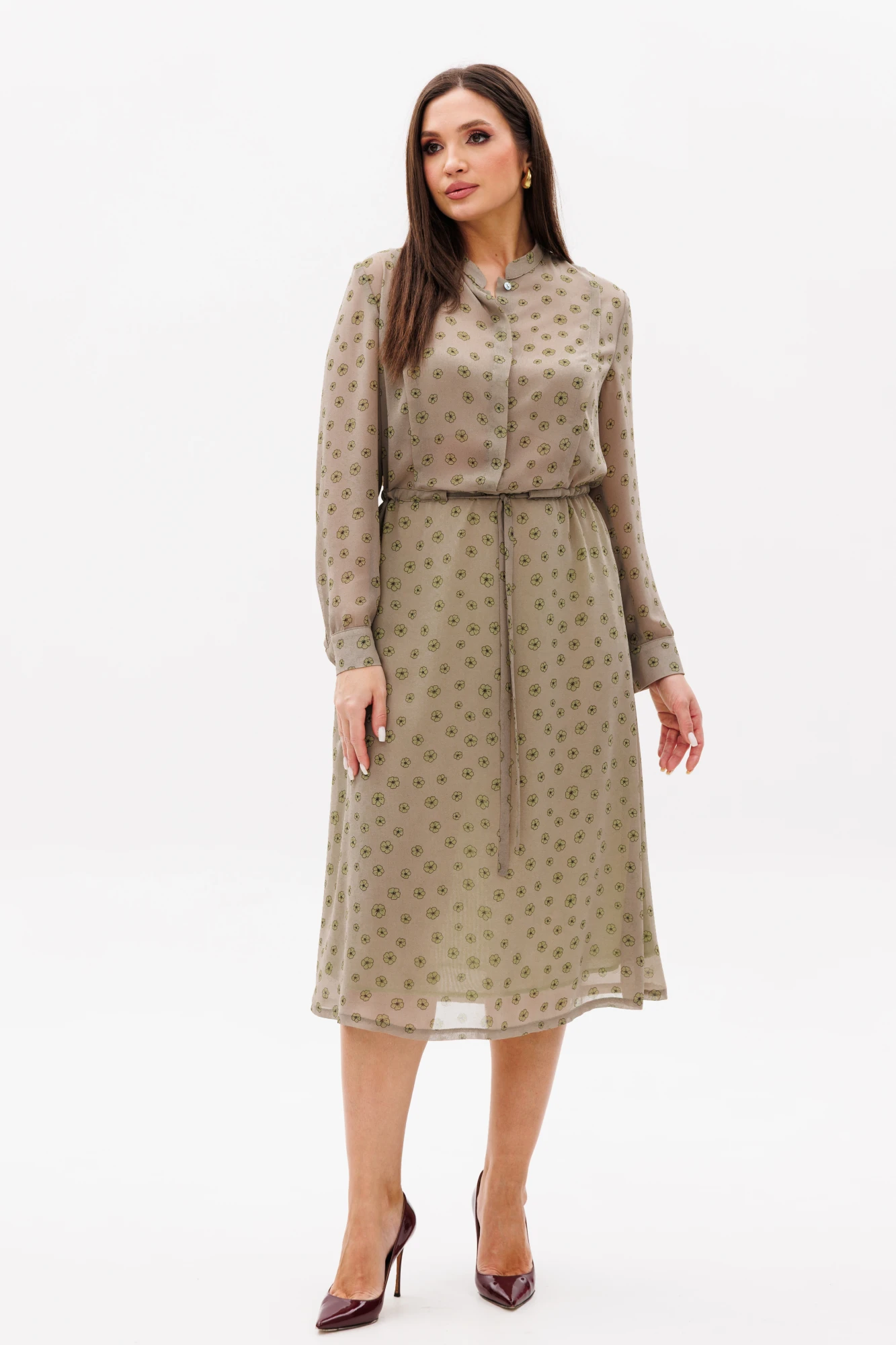Полуприлегающий силуэт, втачной покрой, центральная застежка на потайную планку с петлями и пуговицы. Воротник-стойка. Рукав на притачной манжете с застежкой, лиф отрезной, юбка коническая. Полочка лифа платья с вертикальным рельефом со складкой, рукав с разрезом и мягкой складкой по линии притачивания манжеты, по лини талии настрочная кулиса с регулирующей тесьмой.