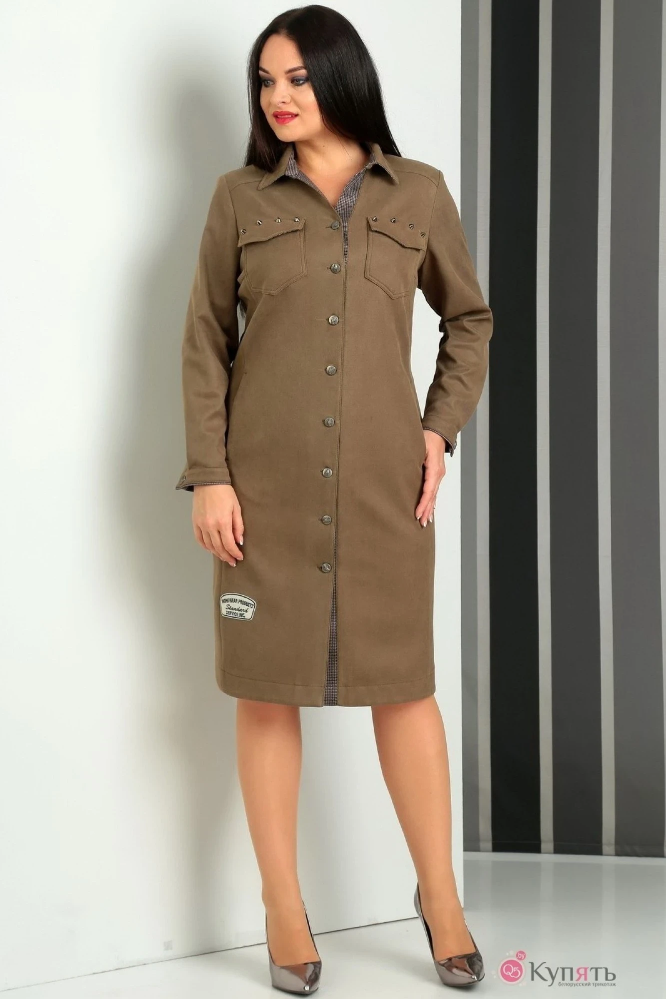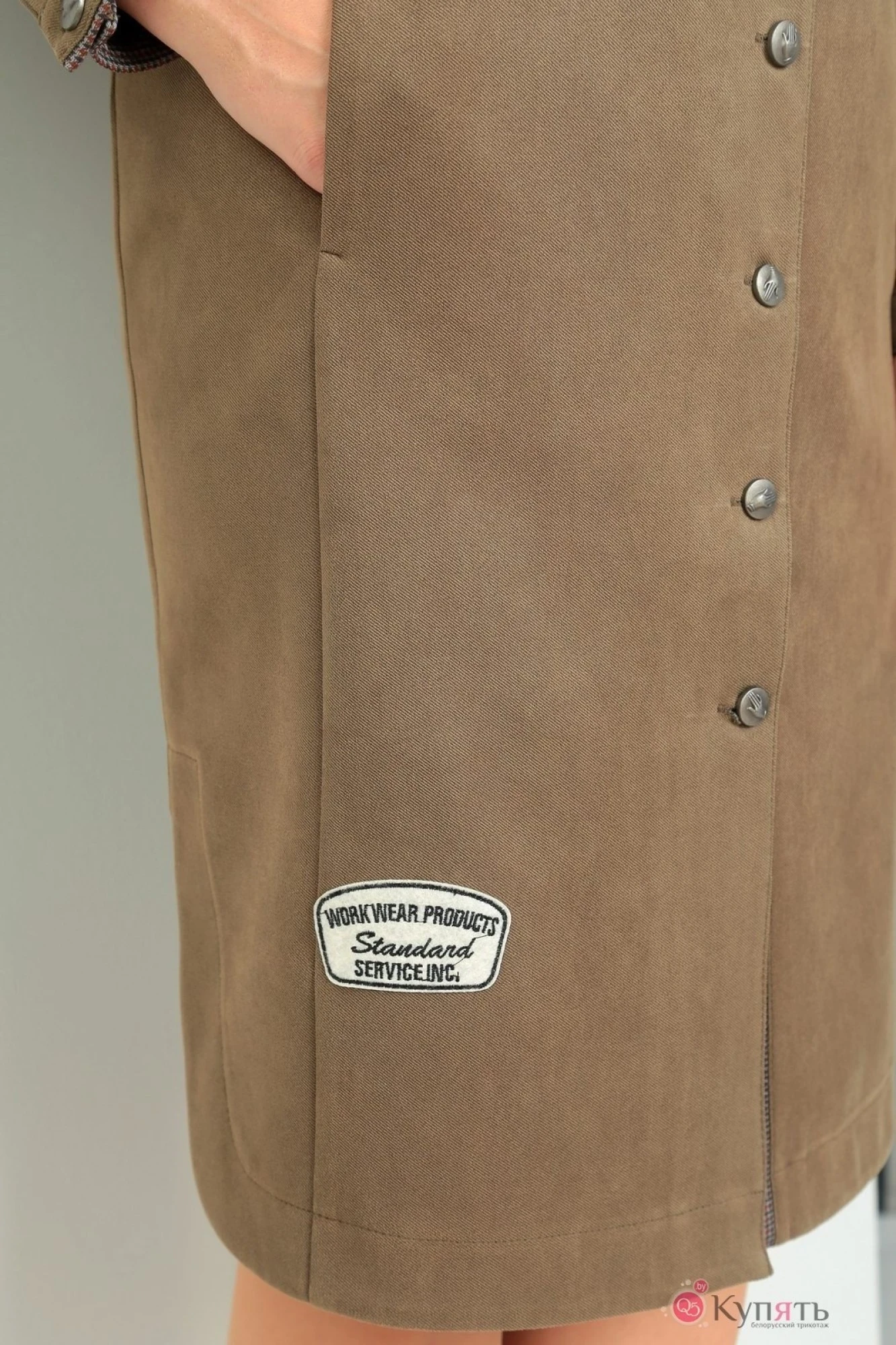 Платье – рубашка, прямого силуэта из плотной. костюмной ткани. Можно использовать в виде удлиненного жакета с брюками. Воротник стояче-отложной, застежка на петли-пуговицы. По переду кокетки, накладные карманы с клапанами. Рукава втачные, длинные, на манжетах, с застежкой не пуговицу. По бокам фигурные разрезы. Декор – отделочной строчкой, тканью и нашивка.