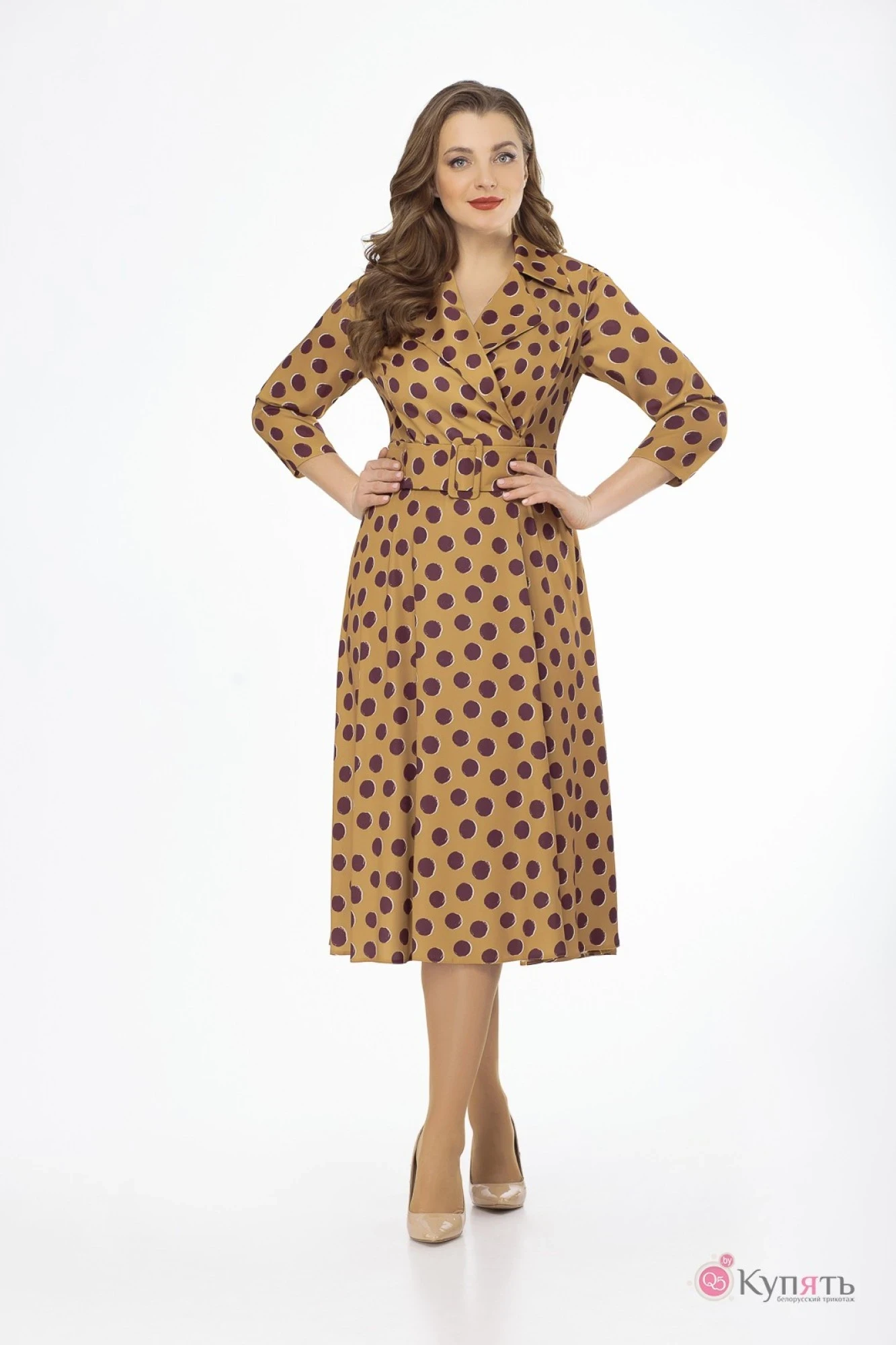Платье отрезное по линии талии,лиф платья эмитация запаха,в левом боковом шве,застежка молния.Воротник платья отложной с лацканами,юбка расширенная к низу.Рукав вточной 3/4.Платье дополнено широким поясом.