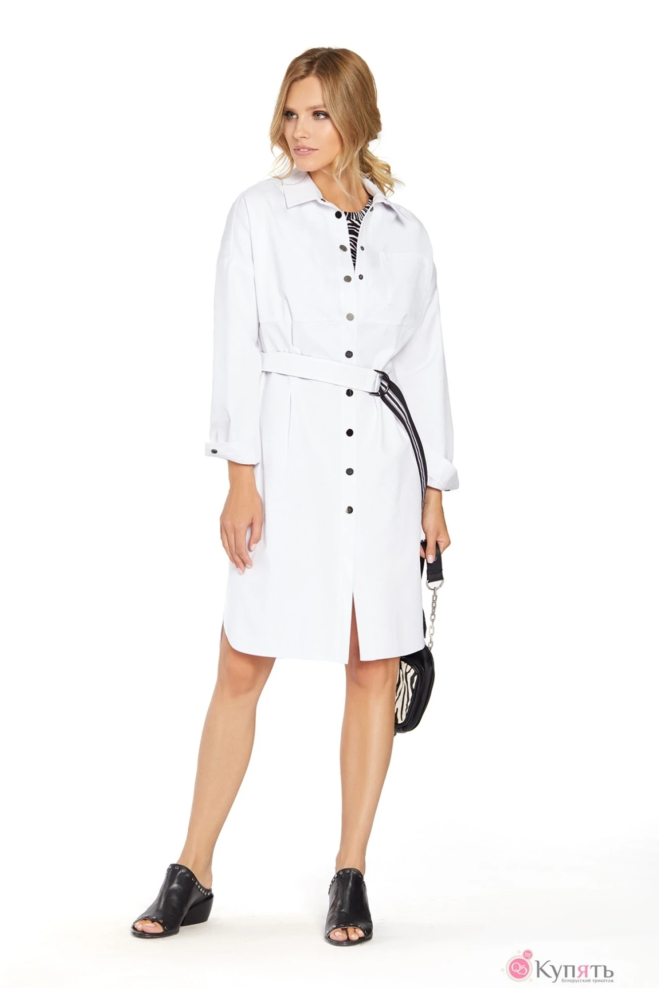 Джинсовое платье-рубашка со съемным поясом и контрастной отделкой. Детали: прямой силуэт со спущенной линией плеча, рубашечный воротник, перед с нагрудным карманом, застежка на кнопки, рукава длинные на манжетах, низ фигурный с разрезами