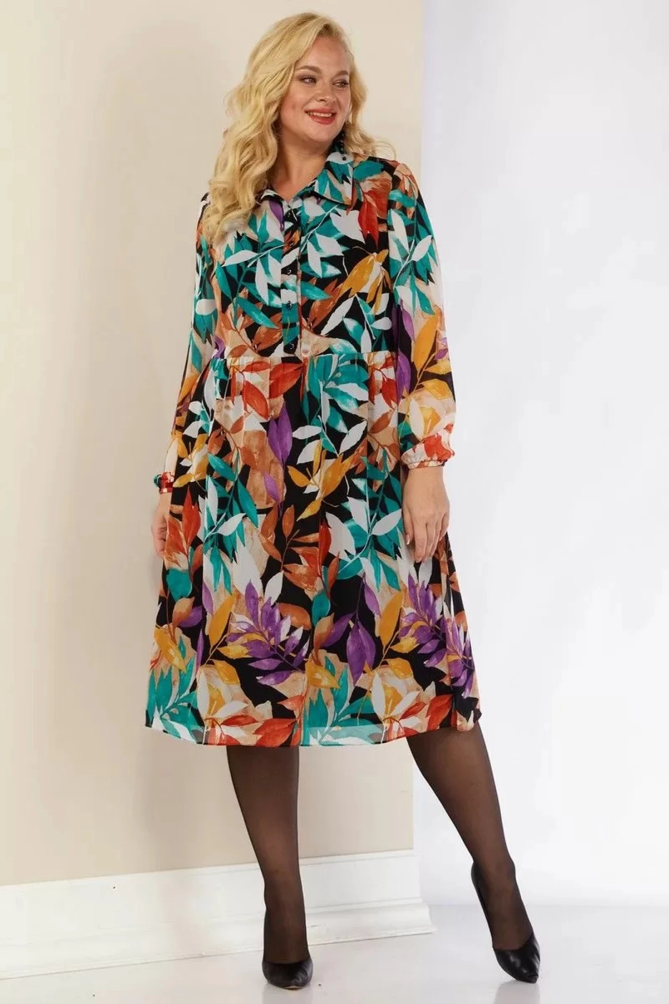 Спинка и полочка отрезные чуть ниже талии, застежка центральная на петли и пуговицы. Нижняя часть спинки и полочки чуть собраны. Рукав одношовный длинный, низ на резинке.
