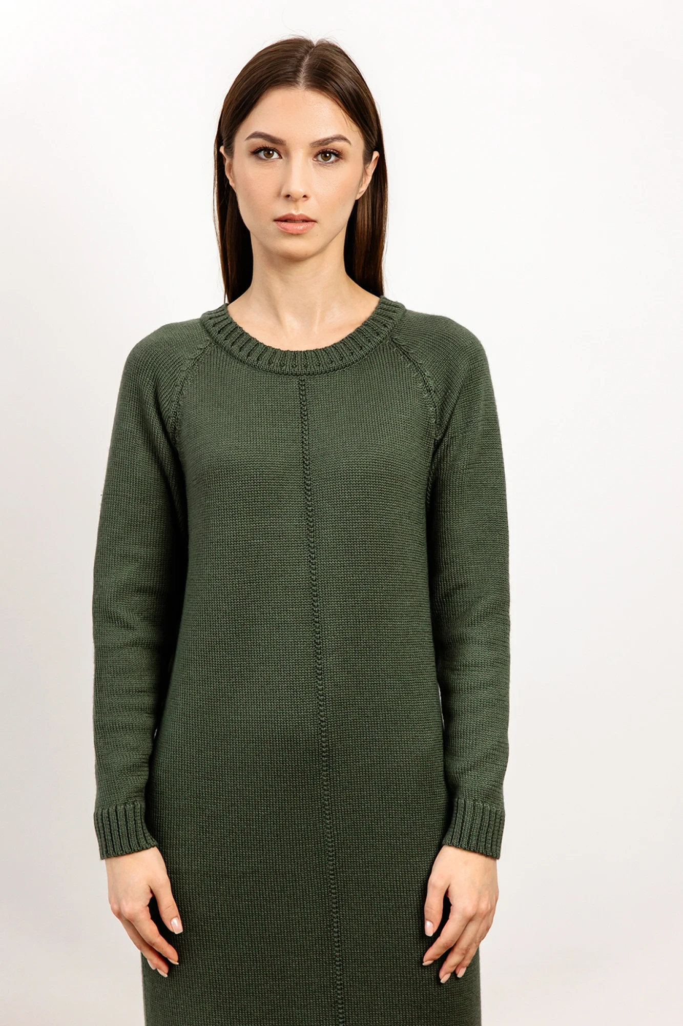 Платье прямого силуэта. Платье очень мягкое и приятное к телу, вывязано переплетением "кулирная гладь". Рукав втачной до уровня локтя. Вырез горловины V-образный обработан накеттлёванной бейкой.