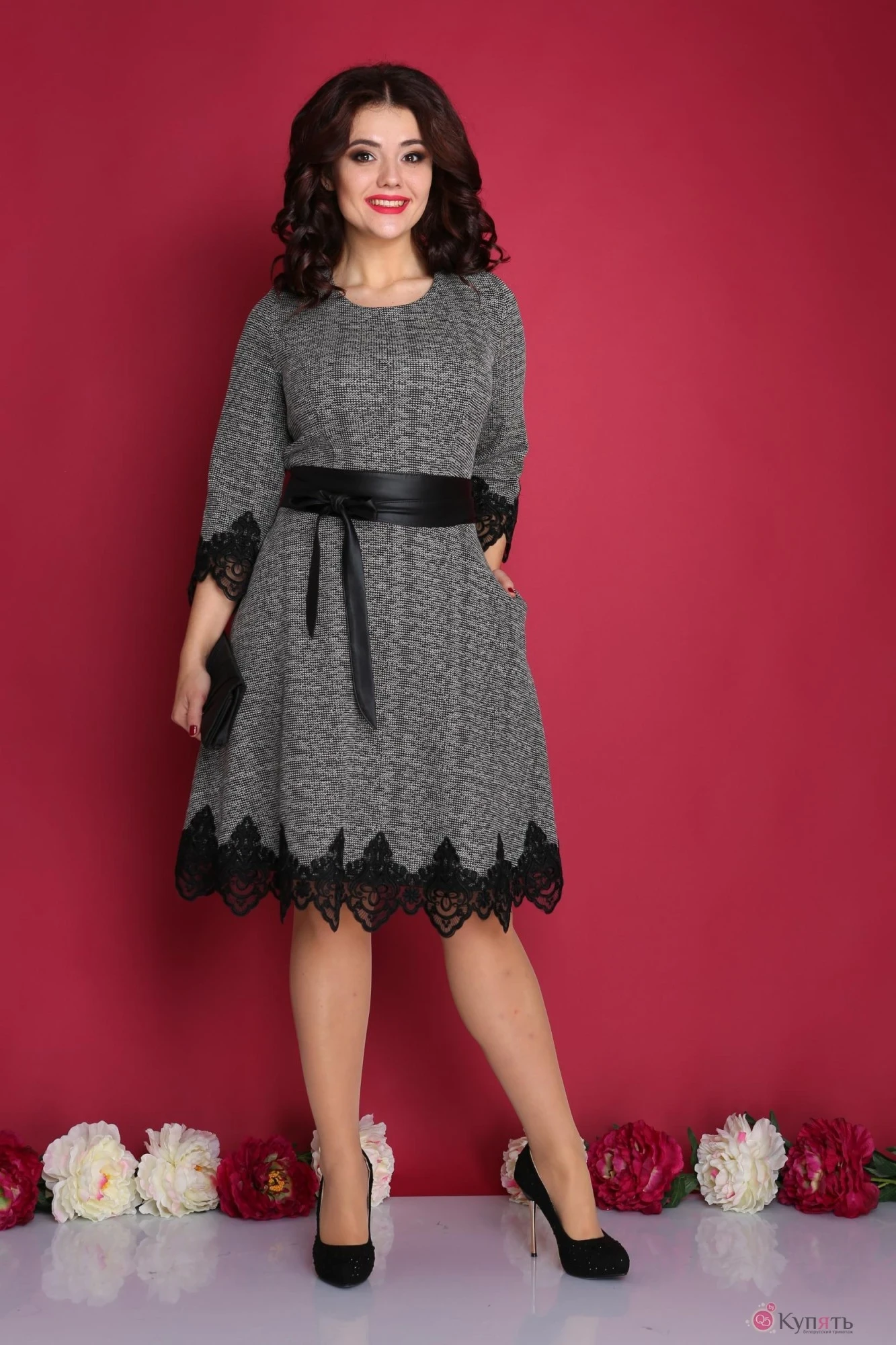 Молодёжная модель выполнена из мягкой трикотажной ткани, с нежным переплетением черного и серого цвета. Дополняет модель кружево, которое подчеркивает низ платья и рукава, придавая платью очень нарядный вид. Платье отрезное по линии талии, юбка колокол, по спинке молния и боковые вытачки, линия талии подчеркивается широким поясом (кушаком).