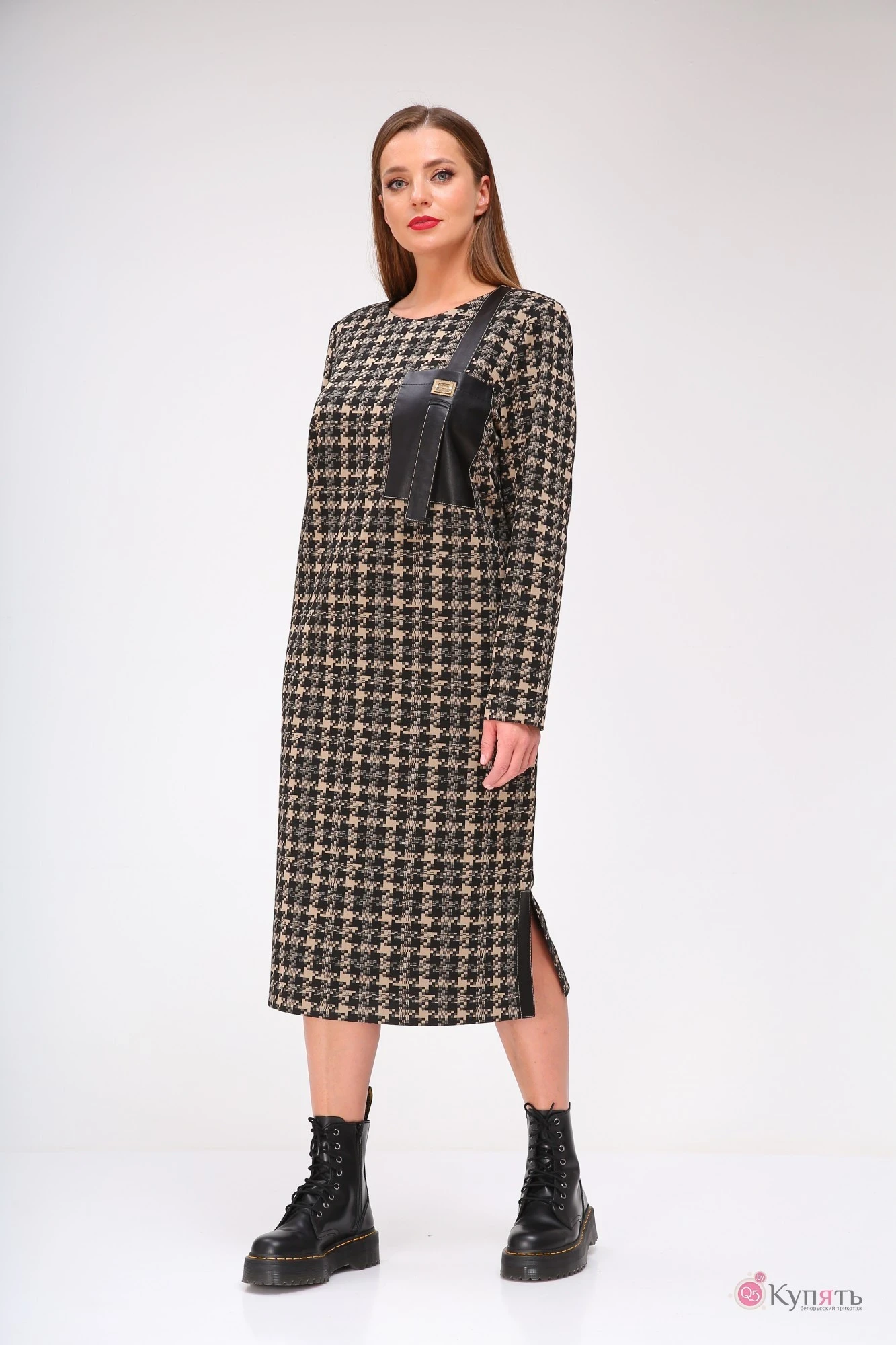 Платье женское прямого свободного силуэта из трикотажного полотна с деталями из экокожи. По переду горловина округлой формы; слева нагрудный карман с петлёй, через которую проходит пата, выходящая из плечевого шва. По спинке: средний шов, по центру от горловины вниз молния. По бокам внизу разрезы с отделкой. Рукав втачной прямой длинный, заужен книзу.