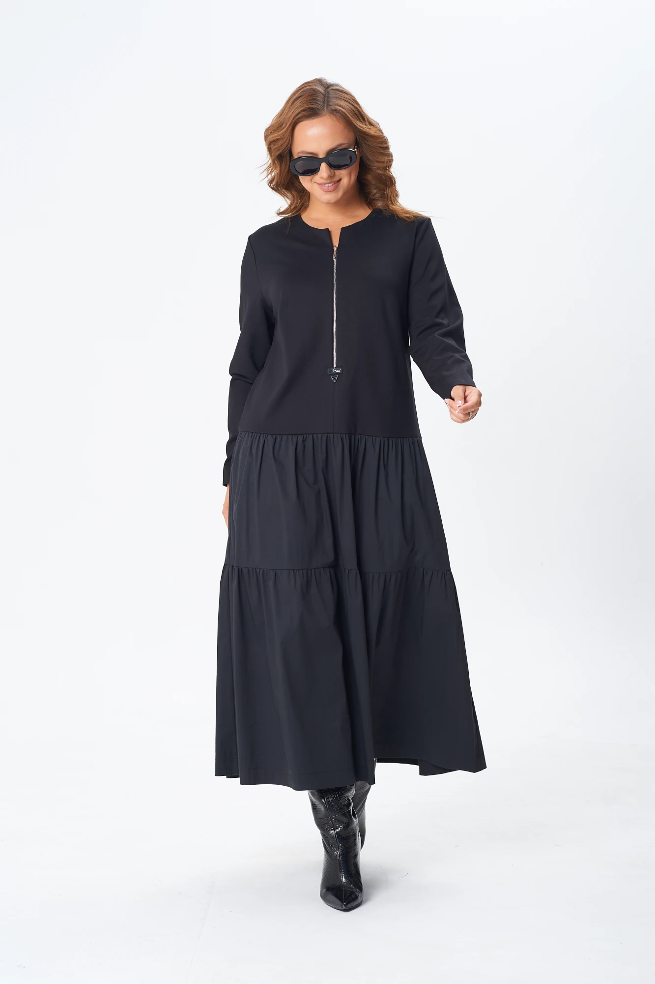 Платье женское в стиле бохо выполнено из двух материалов: лиф-трикотажный, низ платья из однотонной хлопковой ткани. По переду лифа платья центральная застежка на молнию, нагрудные вытачки из бокового шва. По спинке средний шов. Горловина округлой формы обработана обтачкой. Рукав втачной длинный. Нижняя часть платья из двух присобранных воланов, в боковых швах функциональные карманы