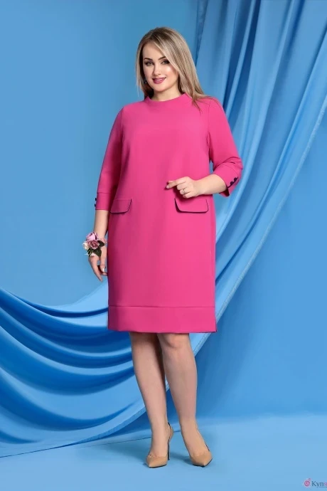 Платье прямого силуэта. Застежка на декоративную тесьму молнию по спинке. Воротник стойка, по концам которого на спинке пробиты люверсы, из которых выходят завязки из отделочной ткани. Рукав втачной одношовный с притачной манжетой, декорированый пуговицами в цвет завязок на спинке. Разрезы в боковых швах на велечину притачной по низу детали. Платье на подкладке. По переду декоративные карманы.