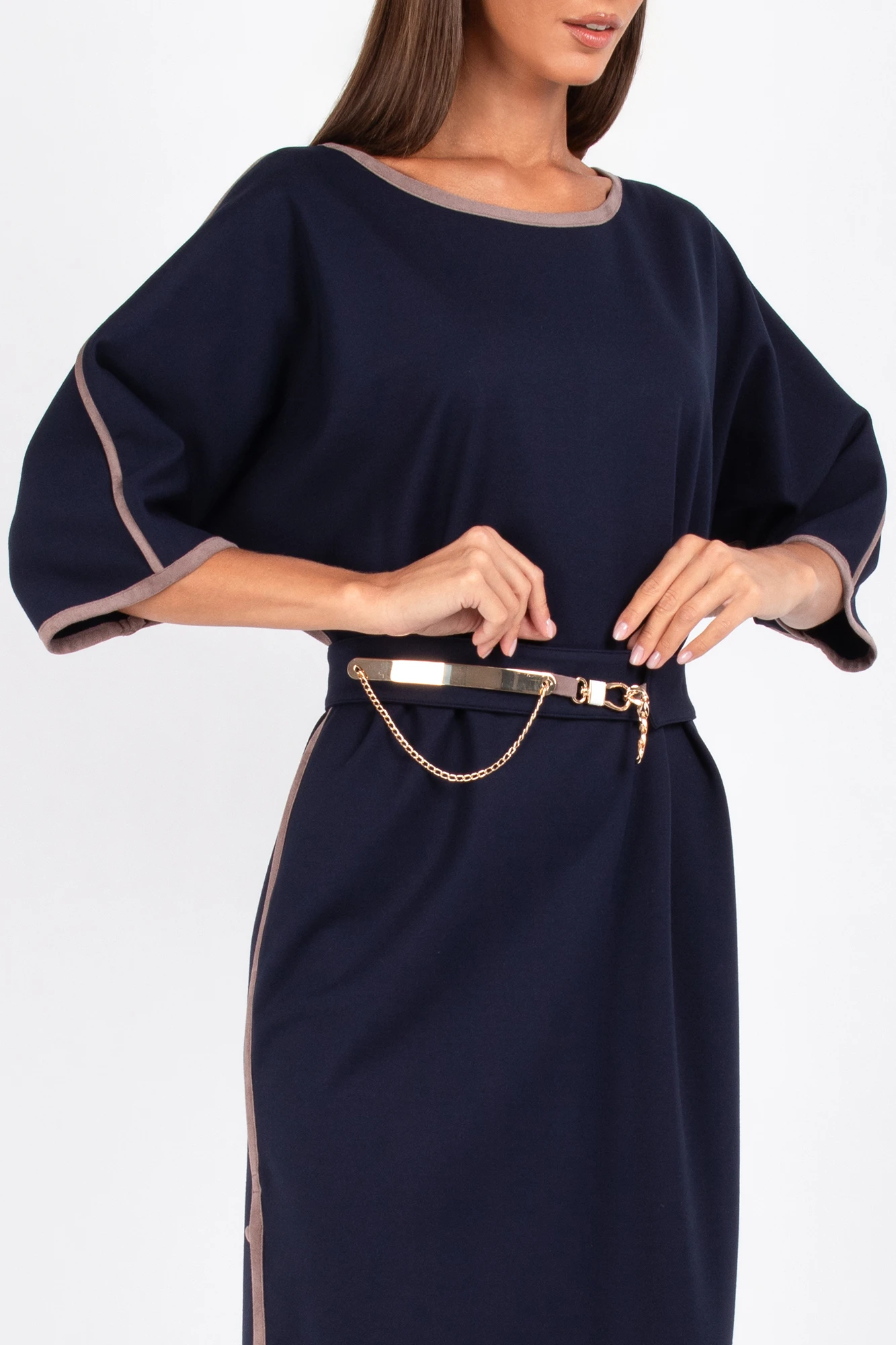 Съёмный пояс с металлическими элементами цвета золота подчёркивает талию и завершает композицию, превращая платье в универсальный вариант для офиса, прогулок или вечерних мероприятий.