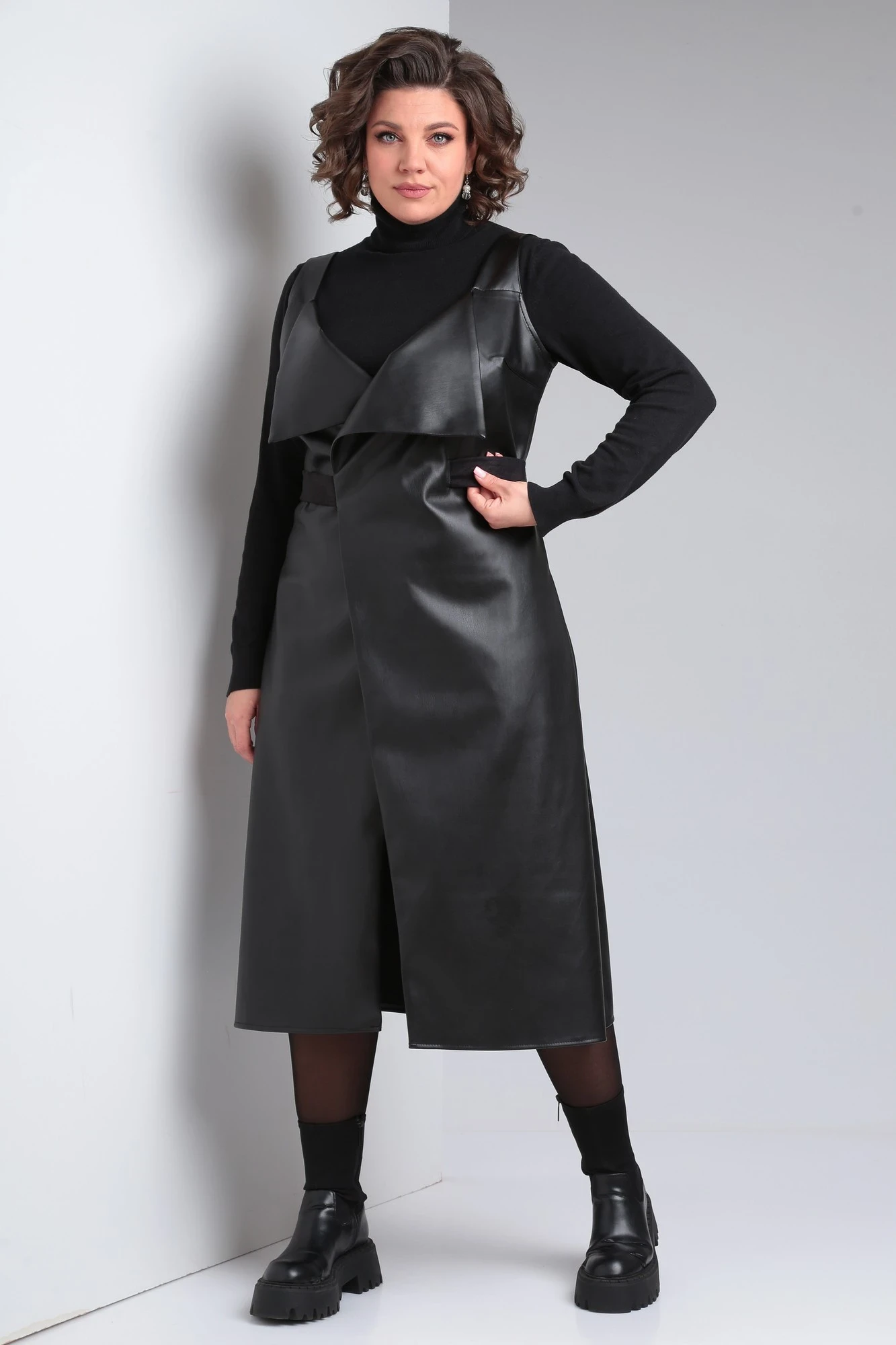 Сарафан без подкладки, выполнен из экокожи высокого качества, изнанка в ткани - замш. Ткань тянется.
