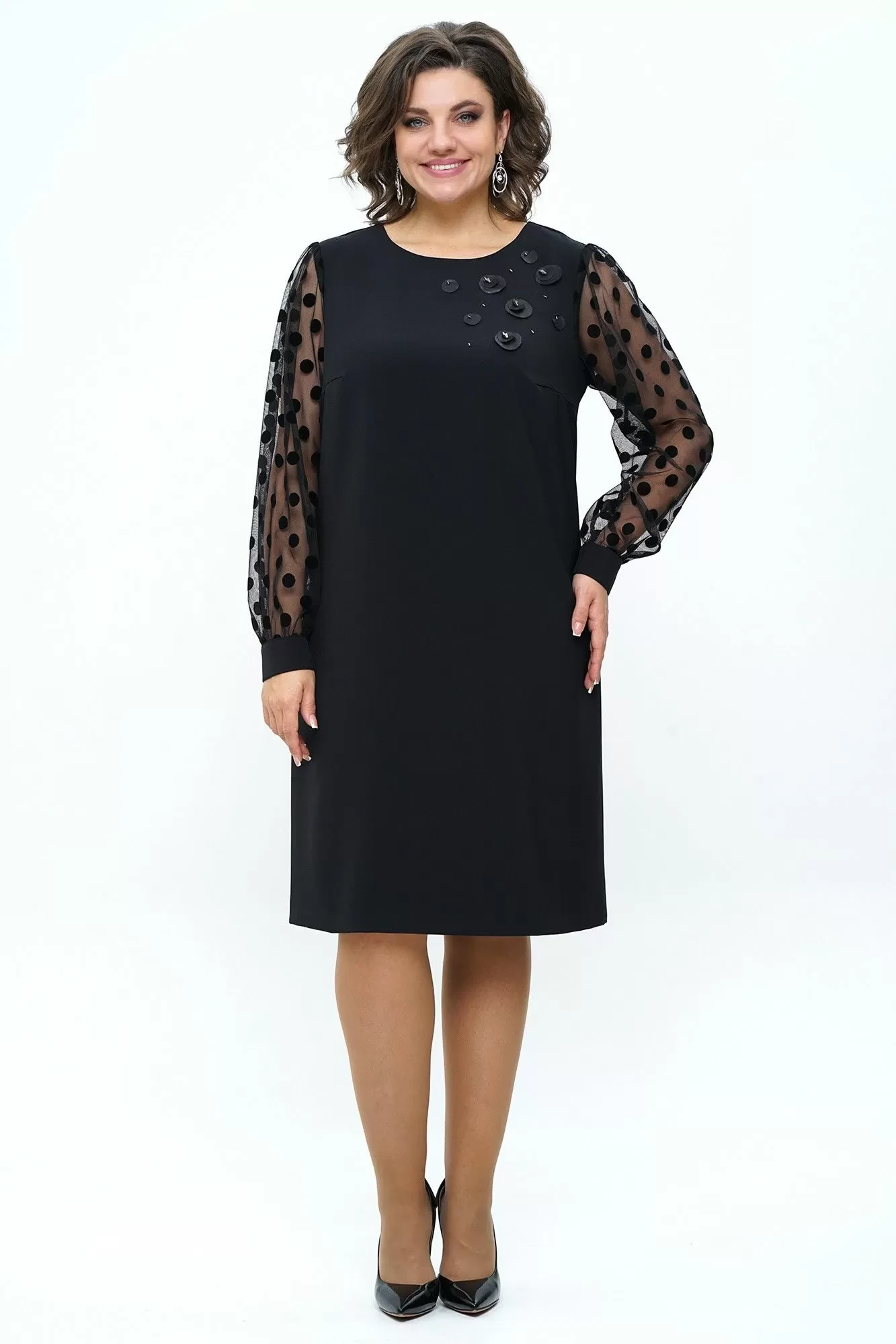 Платье декорировано аппликацией с пришивными стразами.