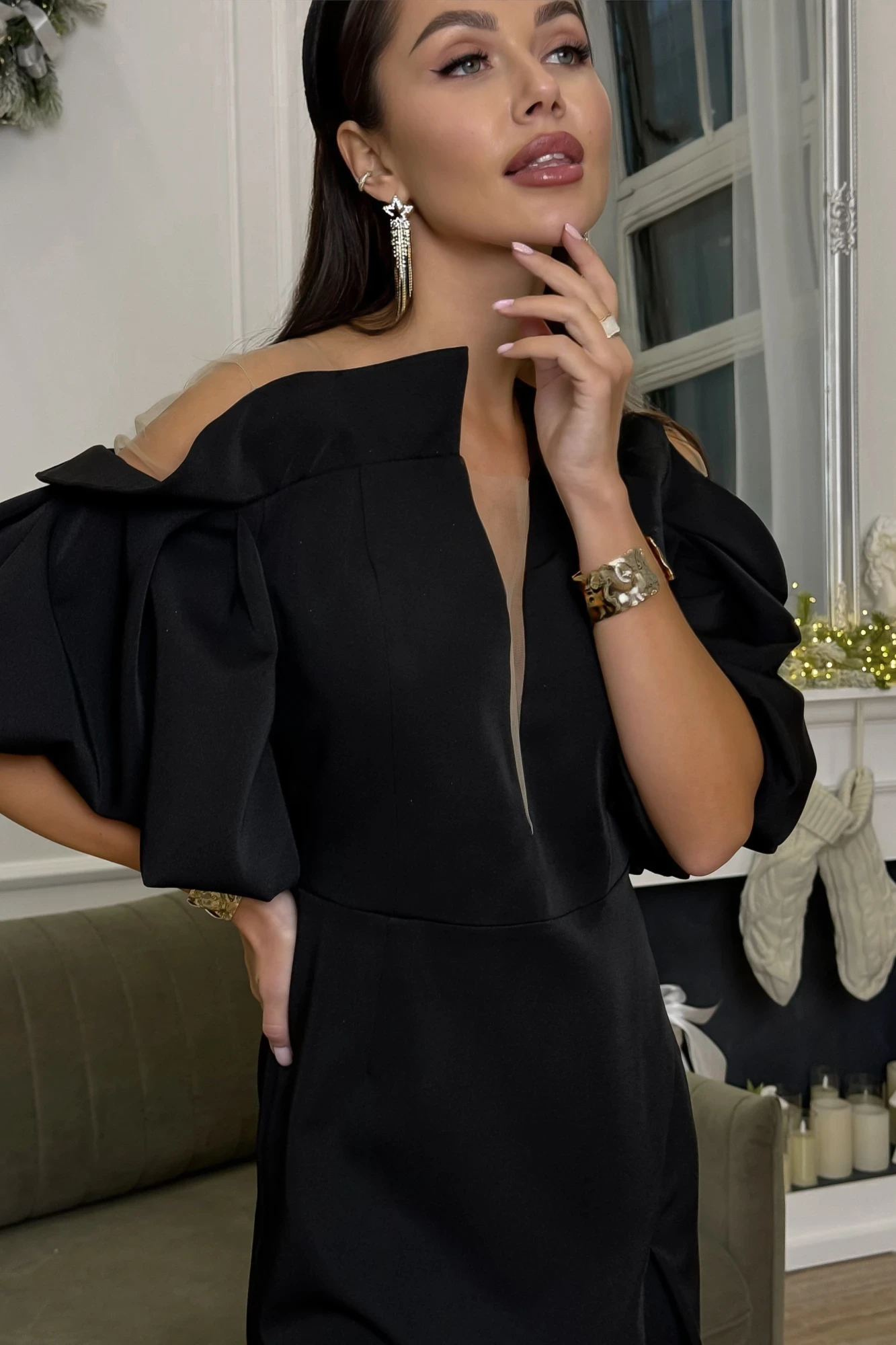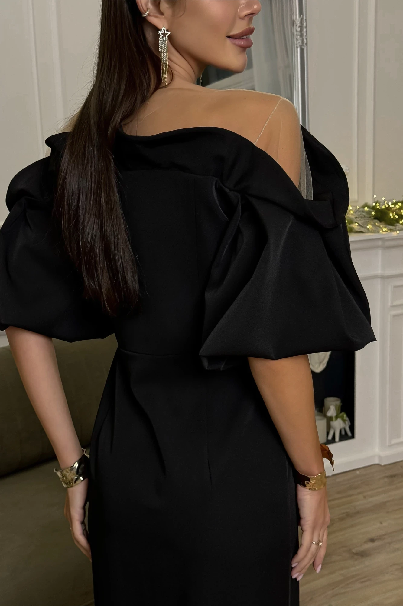 Нарядное вечернее платье, лиф дополнен глубоким вырезом, обработанным нюдовой эластичной сеткой, верхняя часть лифа выполнена из эластичной сетки нюдового цвета, сборка рукава собрана резинку, для дополнительной фиксации выполнены закрепочные швы. Юбка силуэта тюльпан, интригующий вырех по ножке при ходьбе.