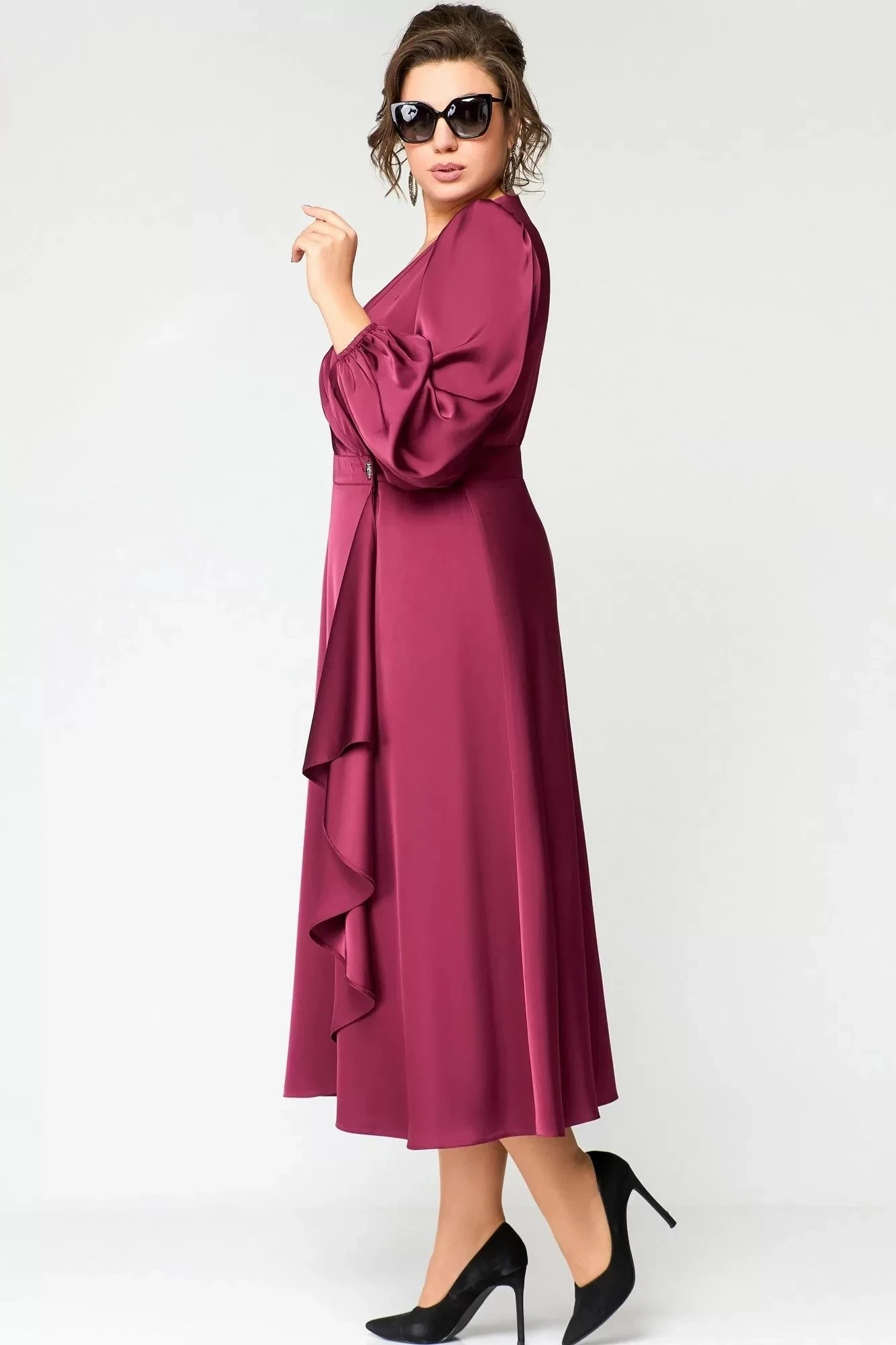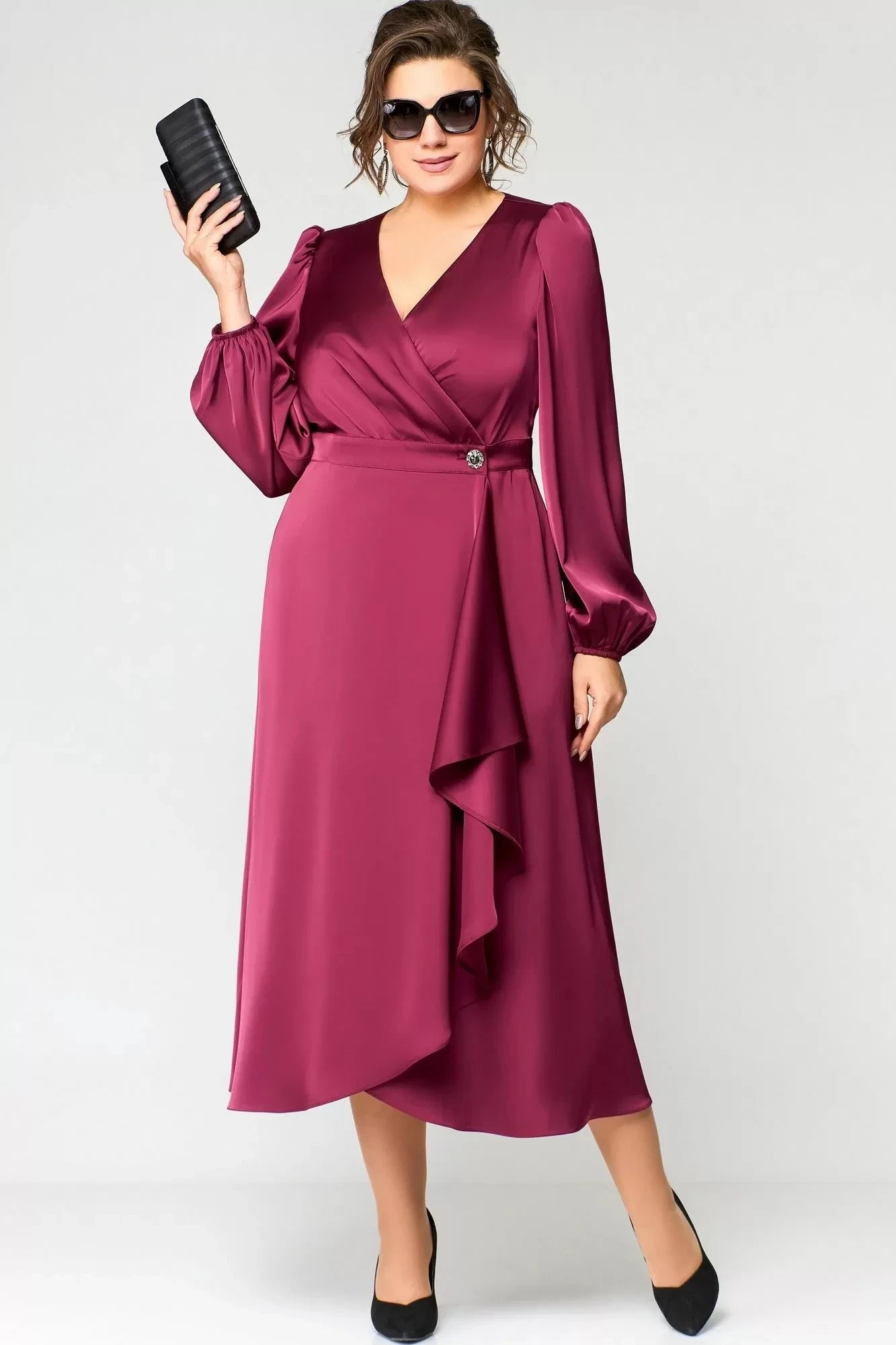Платье женское нарядное на запах. Выполнено из плательной ткани. Вырез горловины V-образный обработан обтачкой. Рукав втачной по окату со сборкой, к низу расширен и собран на тонкую резинку. По спинке небольшая сборка, низ платья фигурный. "Запах" фирсируется декоративной пуговицей со старзами. Декором платья служит отделочная пуговица.