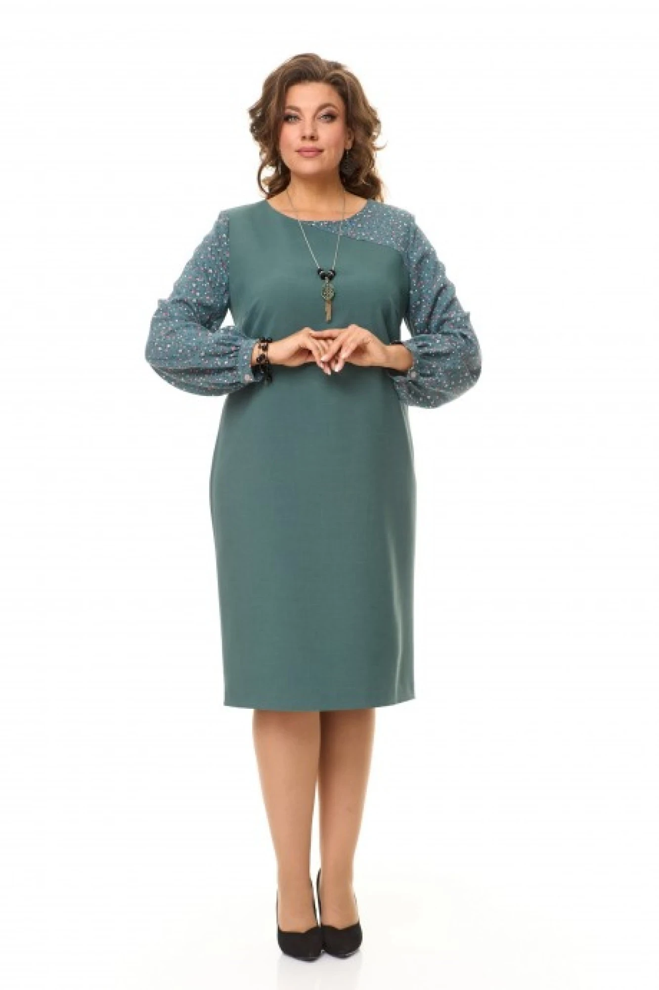Платье женское нарядное прямого силуэта, изготовлено из костюмно-плательной ткани. По груди выточка, по спинке шов и шлица. Косая кокетка по переду и прямая по спинке, выполнена из вискозной ткани. Рука в с манжетой на пуговицу, легкая сборка. Потайная молния в боковом шве. Горловина обработана обтачкой. Украшение в комплект не входит.
