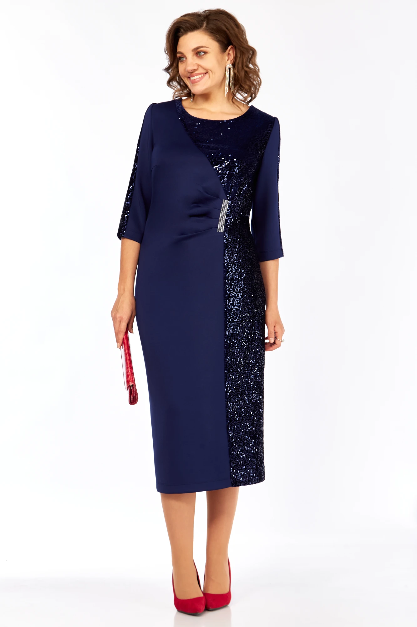 Платье женское, выполнено из 2-х видов тканей, длиной миди. Спинка со средним швом, шлицей на движение и потайной тесьмой-молнией. Перед с нагрудными вытачками из боковых швов, округлым вырезом горловины, и подрезом от правого плеча. Правая деталь переда присобирается в драпировку в области талии. Левая деталь переда из отделочной ткани- бархата с пайетками. Рукав втачной одношовный, длиной 3/4, с лампасом из отделочной ткани.