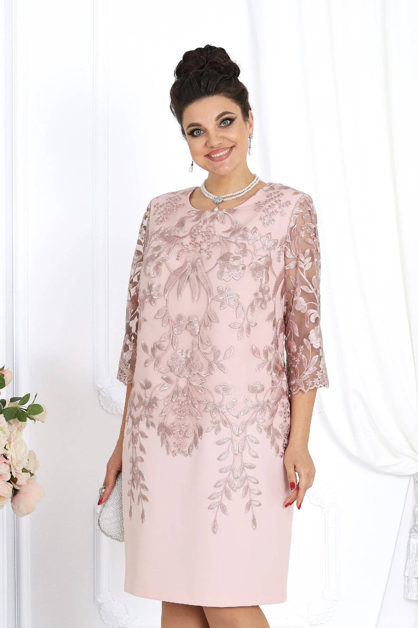 Платье женское полуприлегающего силуэта, зауженное к низу, из костюмно-плательной ткани в сочетании с гипюром. Длина по среднему шву спинки р 50-52 - 101,5 см, р 56-66 – 103,5 см. Перед и спинка двухслойные от плечевого шва до нижней линии бедер, с настрочными декоративными веточками, направленными к низу изделия. Верхний слой выполнен из гипюра. Перед с нагрудными вытачками, идущими из пройм. Спинка, с талиевыми вытачками в нижнем слое, со средним швом, в нижней части которого расположена шлица. В левом боковом шве обработана застёжка на потайную тесьму - "молнию". Горловина переда и спинки округлая, по переду углубленная. Рукава втачные, одношовные, выполнены из гипюра. Низ рукавов оформлен фестонами. Длина рукава 44 см. Платье с плечевыми накладками.