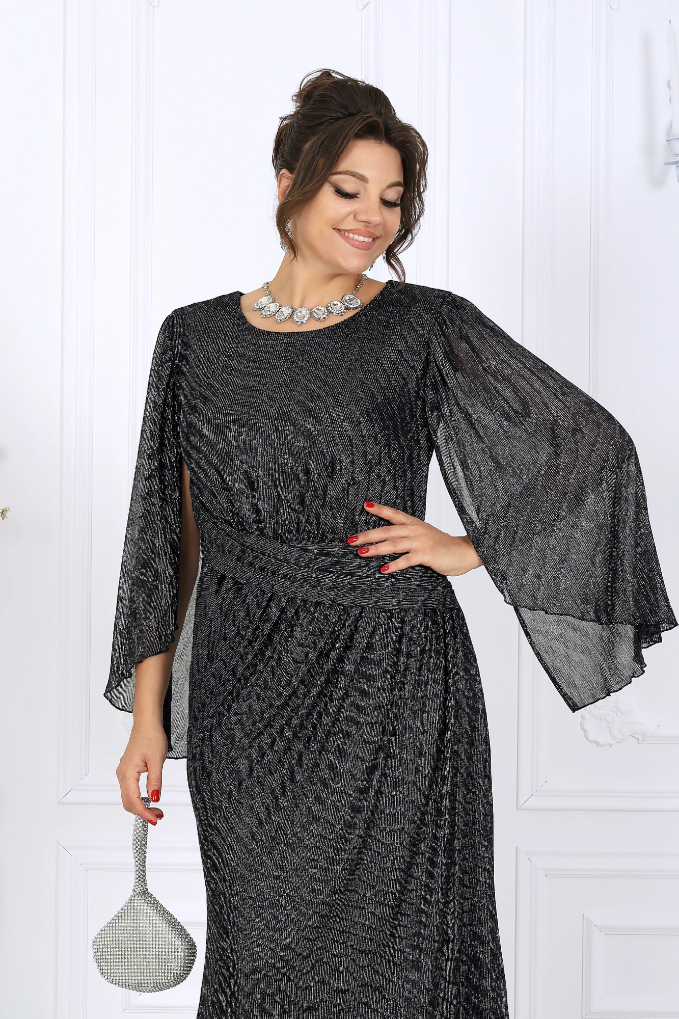 Платье женское, прилегающего силуэта с расширением к низу, выполнено из сетки-гофре с нитью «люрекс». Модель на трикотажной подкладке, без застежки, с плечевыми накладками. В верхней части переда косой подрез со сборкой; в шов подреза входит задрапированный декоративный элемент. На спинке обработаны талиевые вытачки. Вырез горловины переда и спинки округлой формы, по переду углубленный. Рукав без шва, с отлетными краями и фигурным низом, по окату сборка; крепится к пройме только в верхней части. Пройма окантована узкой косой бейкой из основного материала