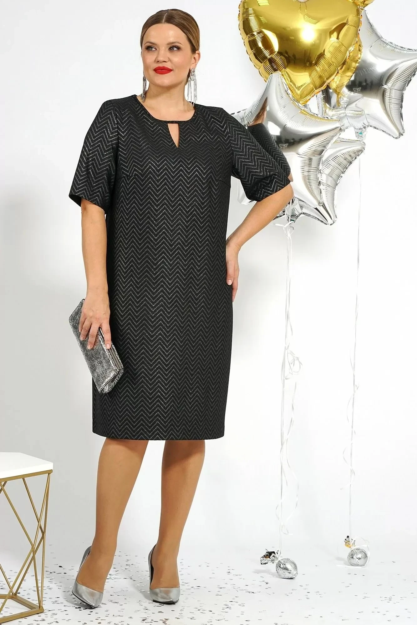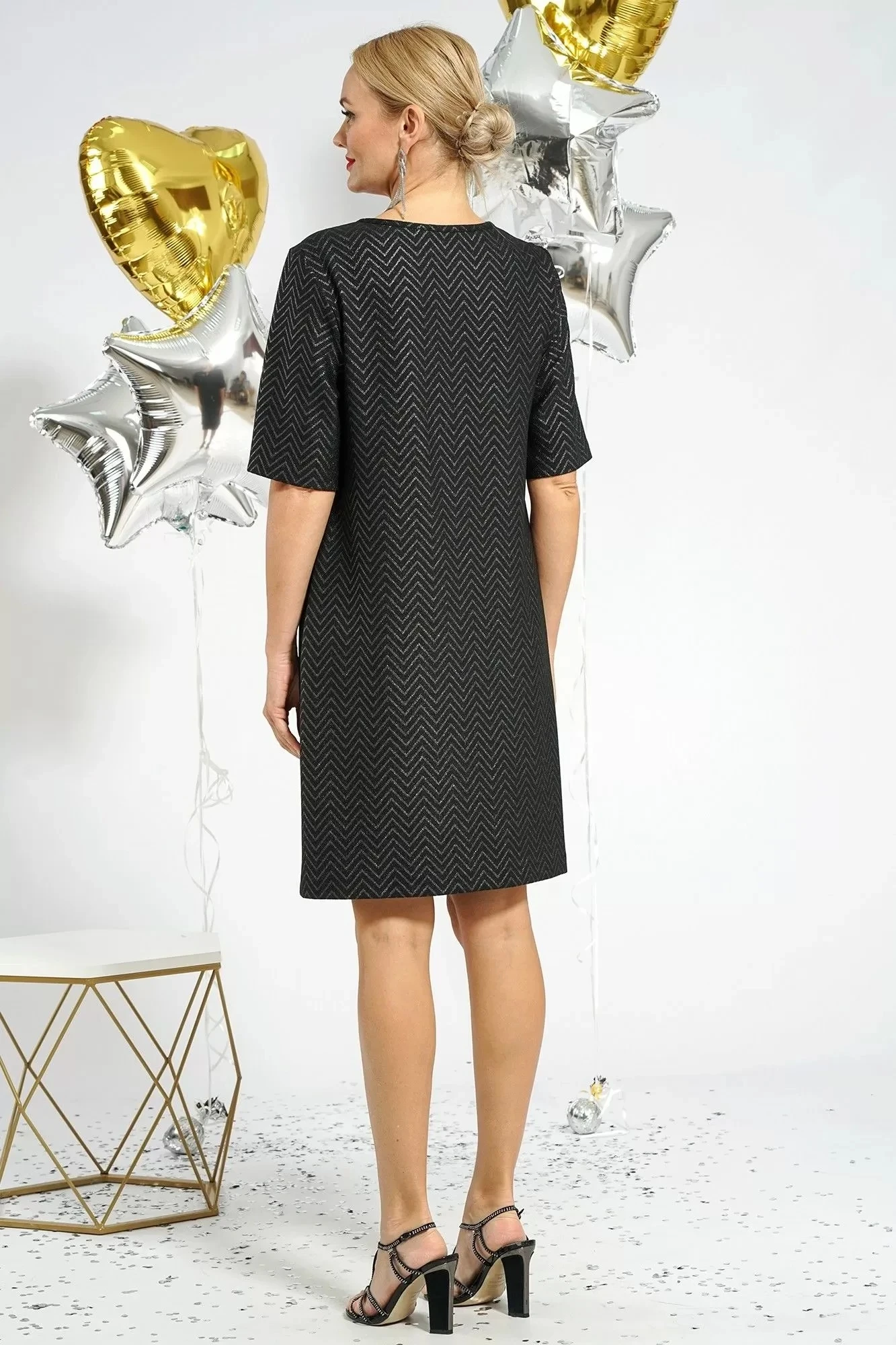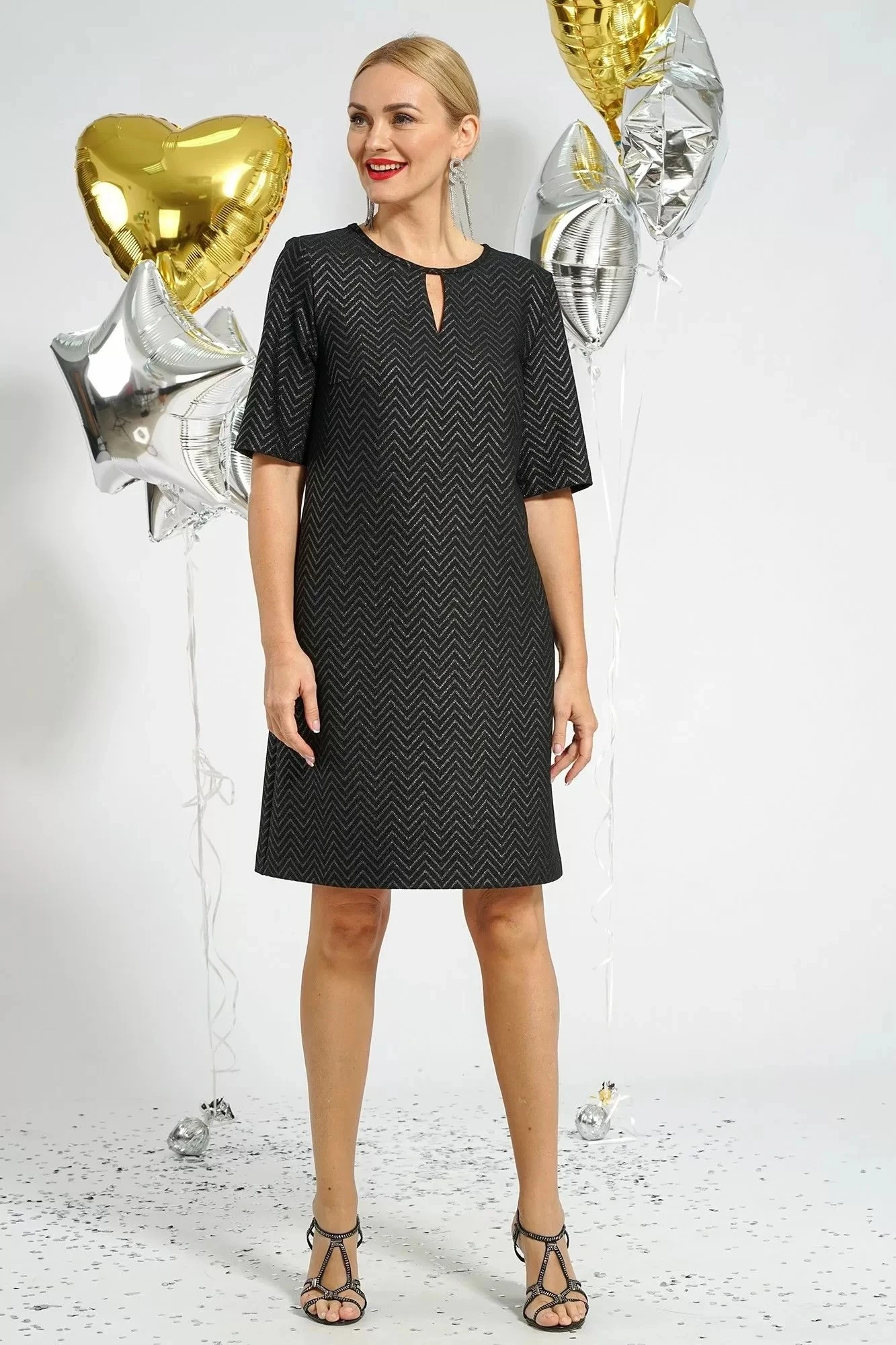 Платье силуэта трапеция. Перед с нагрудными выточками и с V- образным разрезом верху %%по горловине. Рукава втачные, одношовные, короткие. Горловина круглой формы обработана окантовочным швом.
