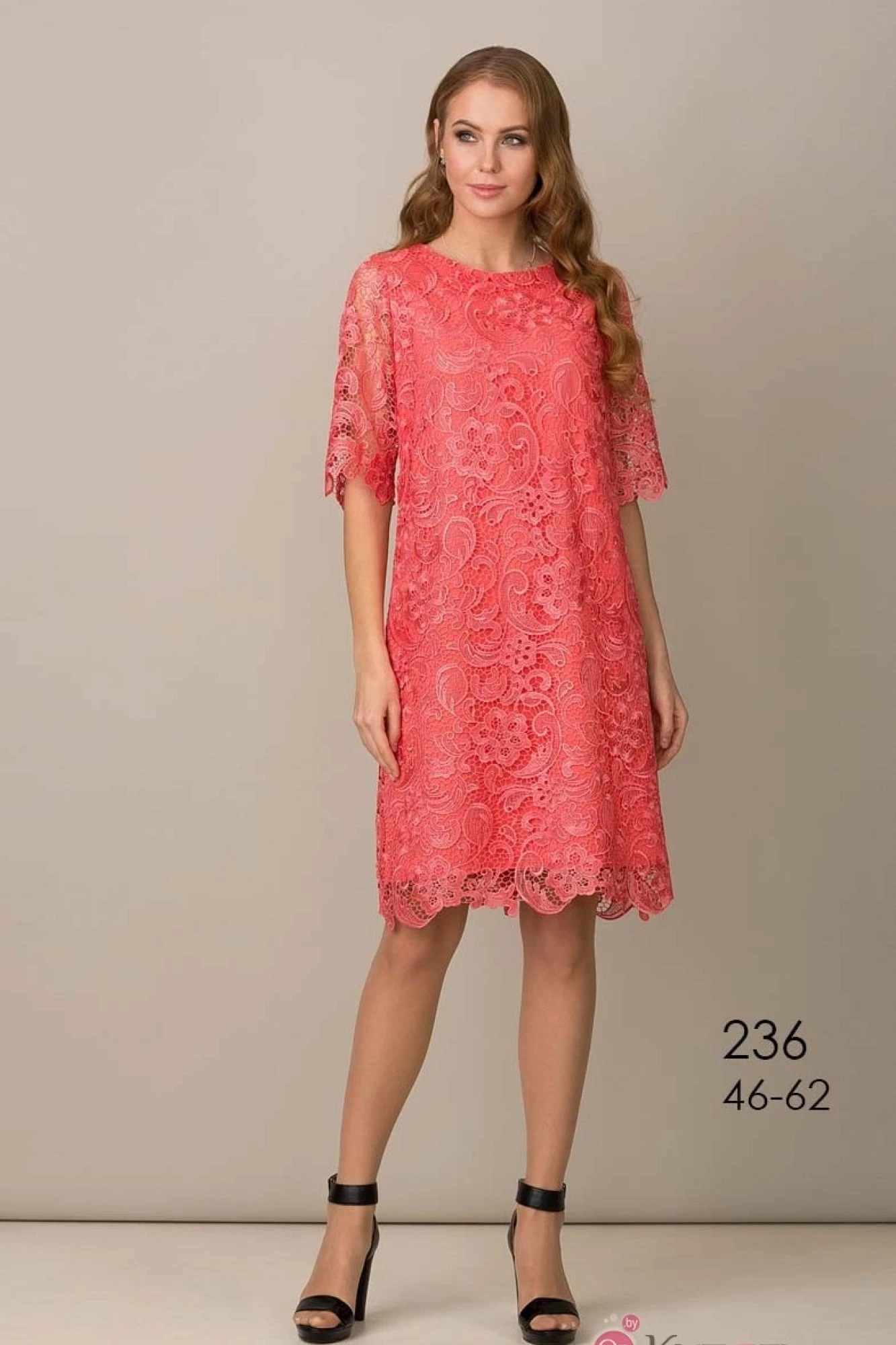 Платье трапециевидного силуэта из гипюра и стрейчевой плательной ткани. Фигурные края низа платья и рукавов, фактура и сочный цвет кружева делают платье роскошным. Рукава до локтя.