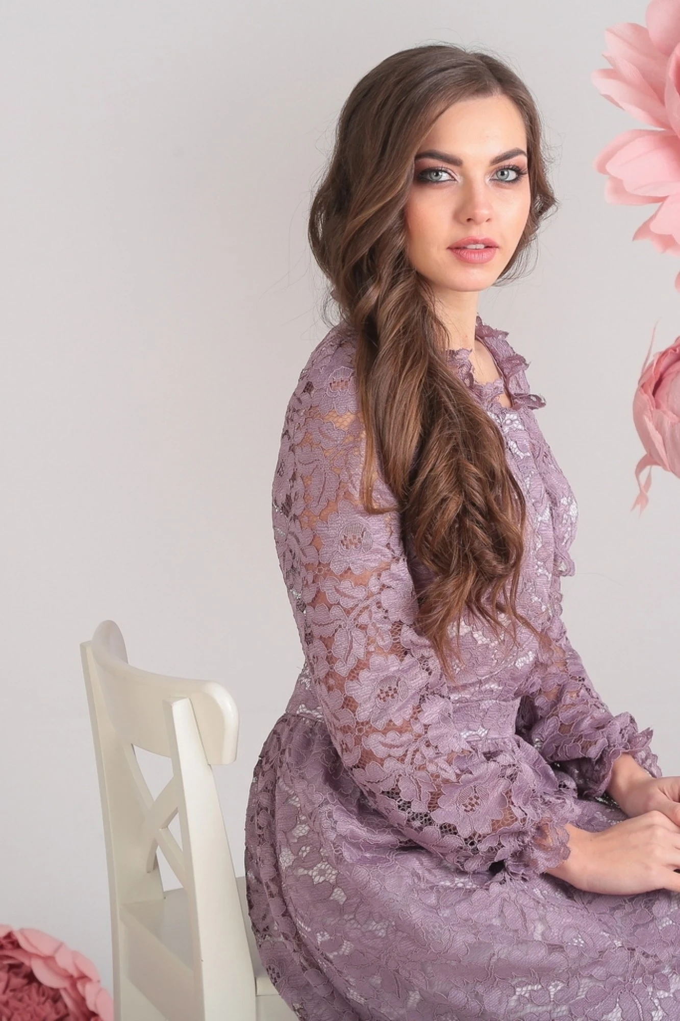 Платье женское нарядное из кружевного полотна и однотонной ткани. Платье расширенного к низу силуэта, длиной 126,0см, с втачным покроем рукава. Платье с отрезным поясом по линии талии. Перед платья с нагрудными и вертикальными вытачками. Спинка с вертикальными вытачками. Юбка платья со сборкой по линии талии. Горловина круглой формы. По переду с застежкой на потайные кнопки. По горловине и по застежке идет полоса кружева из основного полотна. Рукава одношовные, длиной 65,0см, с учетом напуска. Низ рукава собран на «венгерку». В левом боковом застежка на потайную тесьму-молнию длиной 35,0см.