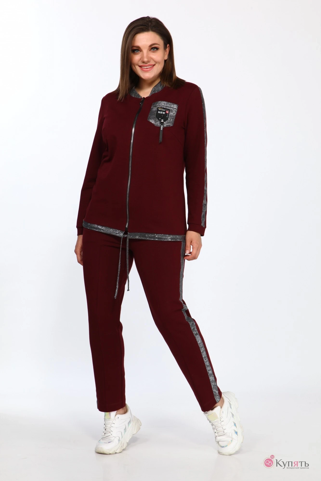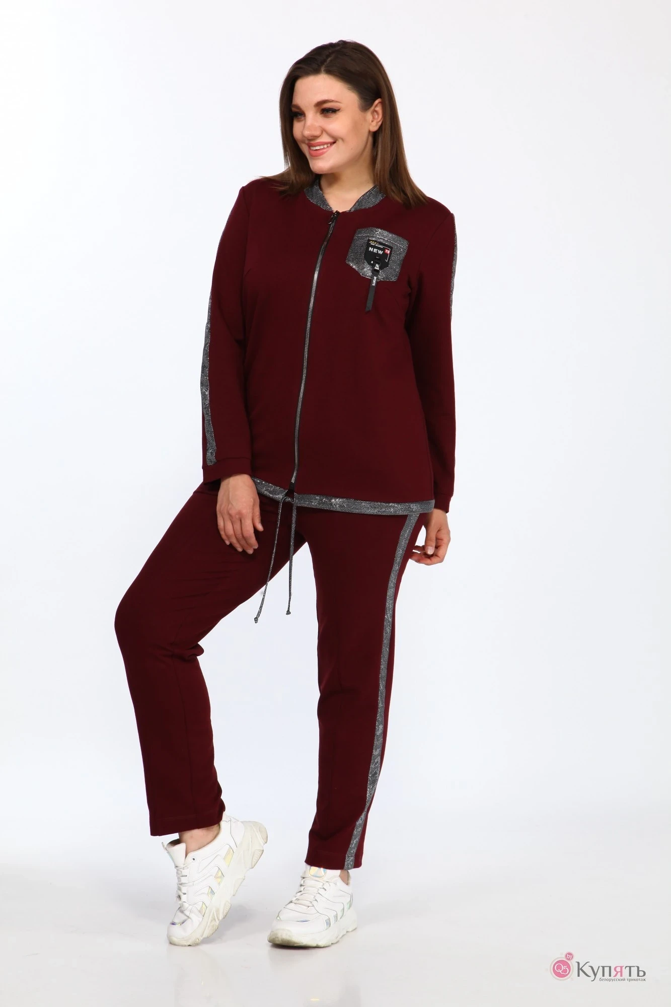 48,50,52,54,56, 58 ,60,62,64Стильный женский костюм двойка, состоит из блузона и брюк. Костюм выполнен в спортивном стиле.