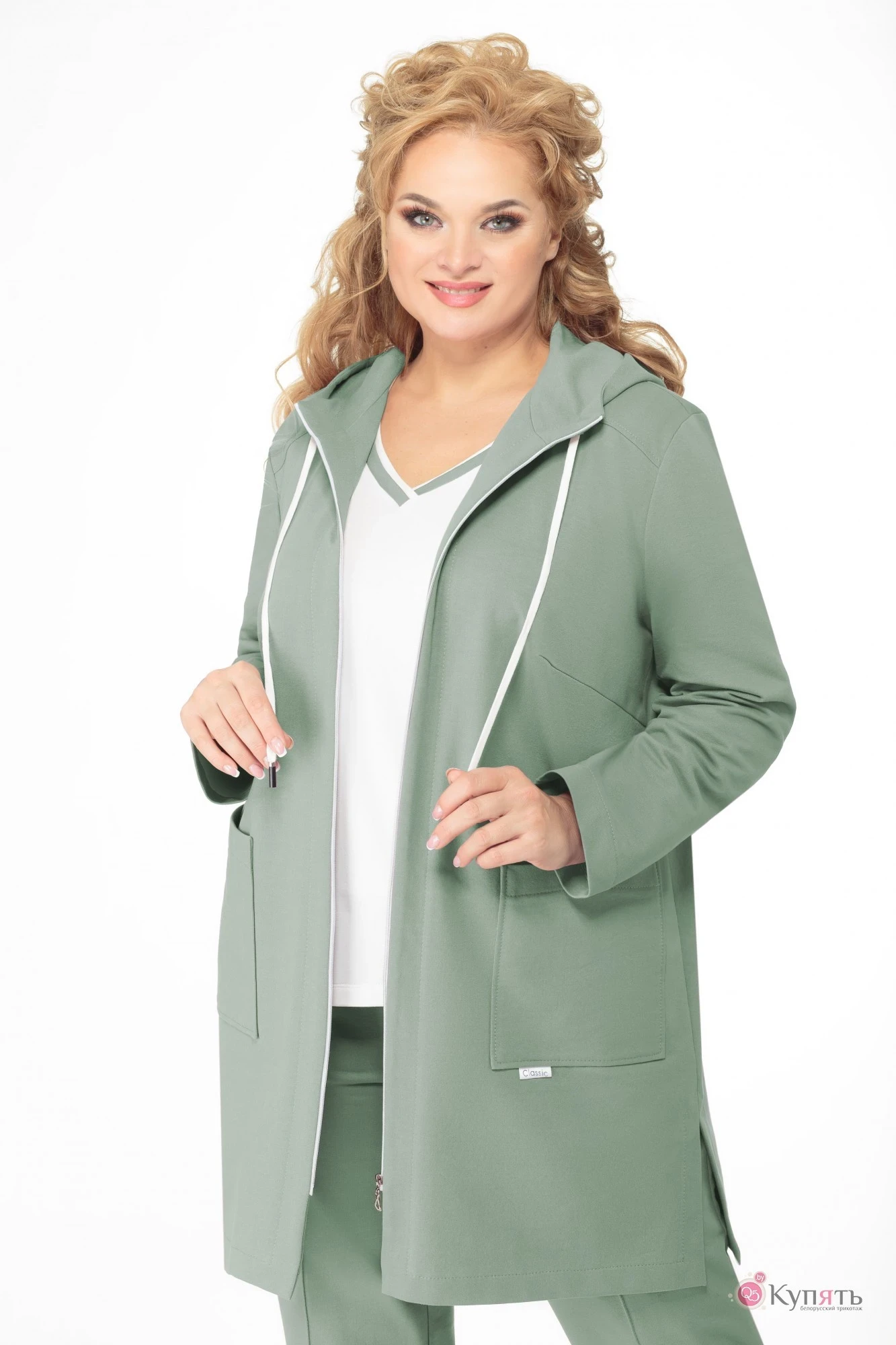Жакет полуприлегающего силуэта. По переду центральная застежка на тесьму «молния», на уровне бедер накладные карманы, горловина с капюшоном, в низу по боковым швам разрезы. Рукава втачные, длинные.