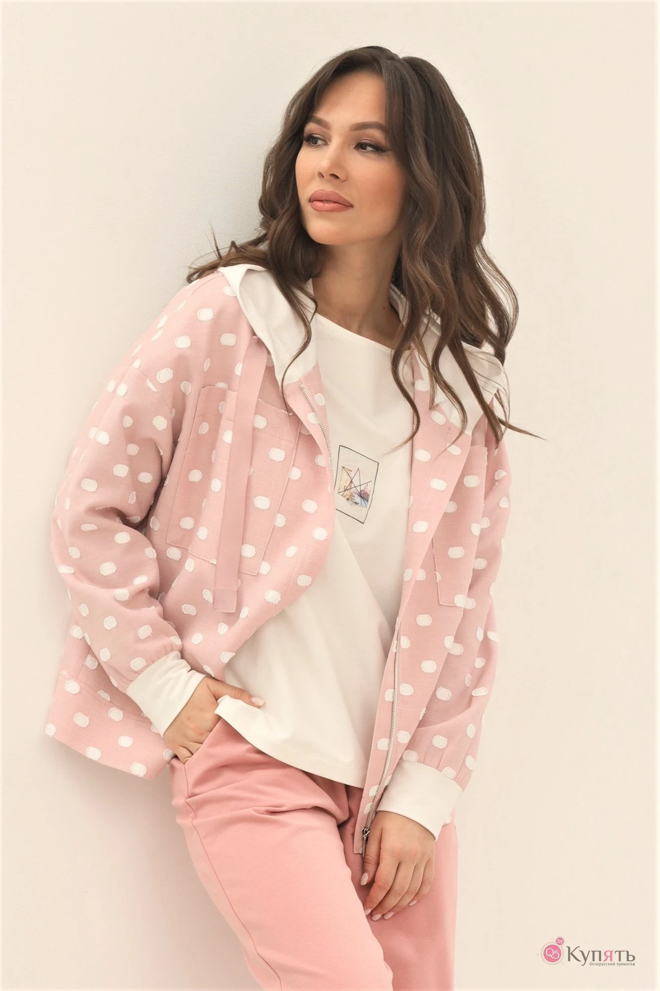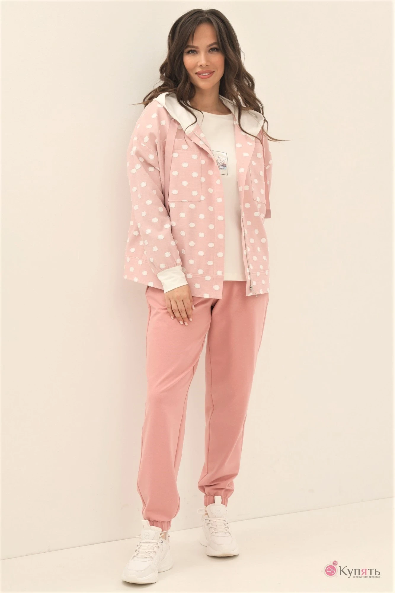 Стильный комплект, состоящий из бомбера, блузы и брюк. Бомбер свободного кроя со спущенным рукавом, с центральной застежкой на молнию. Выполнен из жакардового полотна. Низ рукава с притачной манжетой , выполненной из однотонного трикотажного полотна. Бомбер дополнен капюшоном и нагрудными карманами. Блуза прямого кроя с коротким цельнокроеным рукавом. Декорирована нагрудной аппликацией. Брюки свободного кроя, на притачном поясе с эластичной тесьмой, дополнены боковыми карманами. Выполнены из однотонного трикотажного полдотна. По низу брюки сборены на эластичную тесьму. Длина куртки от плечевого шва 65см. Длина рукава 64см. Длина блузы 61см. Длина брюк по боковому шву 98 см.