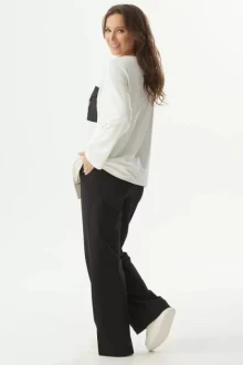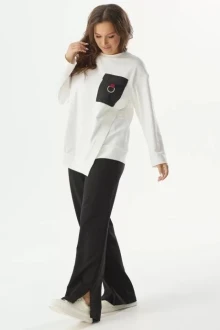 Стильный костюм из свитшота и брюк. Выполнен из футера без флиса. Свитшот свободного кроя со спущенным рукавом. Низ выполнен с асимметрией. Горловина округлой формы. На груди накладной карман с клапаном и декоративным элементом. Сбоку молния(имитация кармана) Брюки прямого свободного кроя, с притачным поясом, дополненным эластичной тесьмой. Посадка средняя. По бокам брюки дополнены удобными карманами. По низу брюк разрезы.