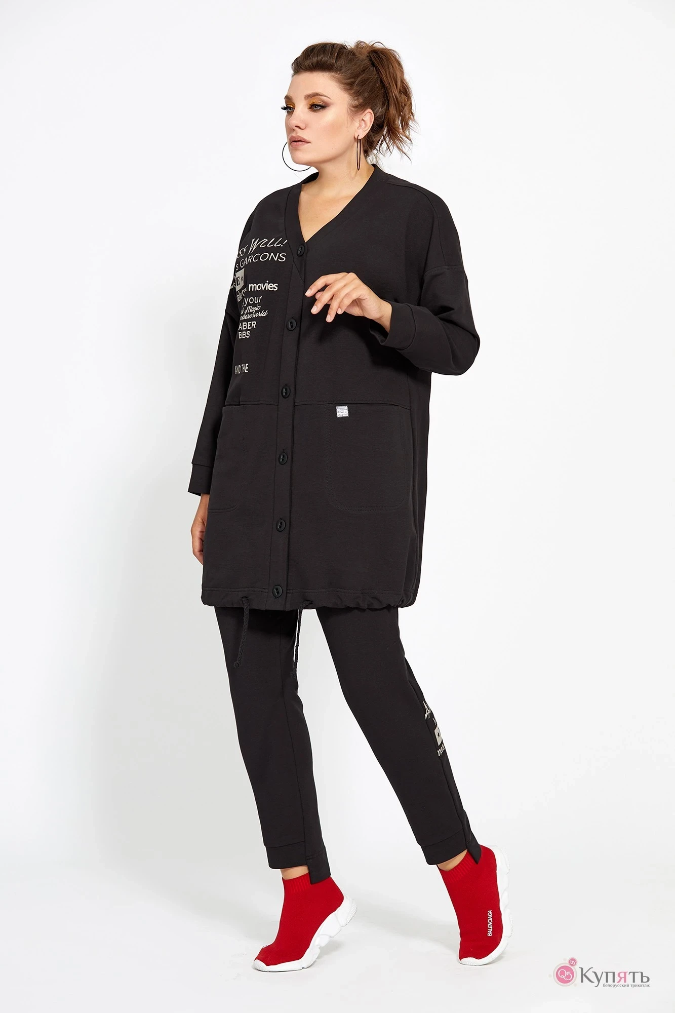Костюм женский двух предметный спортивного стиля, состоящий из удлиненного жакета и брюк. Жакет прямого силуэта со спущенным плечом выполнен из трикотажного полотна (тянется), вырез V-образный, застежка доверху на обметанные петли и пуговицы. По полочкам два накладных кармана, по низу втянут декоративный шнур. Декором служит принт по полочке. Брюки спортивного стиля зауженные к низу на притачном поясе (пояс по всей длине на резинке). В боковых швах обработаны карманы. Низ брюк фигурный (по спинке длиннее). Выполнены из трикотажного полотна (тянется). Декором служит принт на передней половинке брюк. Длина жакета – 88 см. Длина рукава – 62 см. Длина брюк по спинке – 101 см, по переду – 97 см.