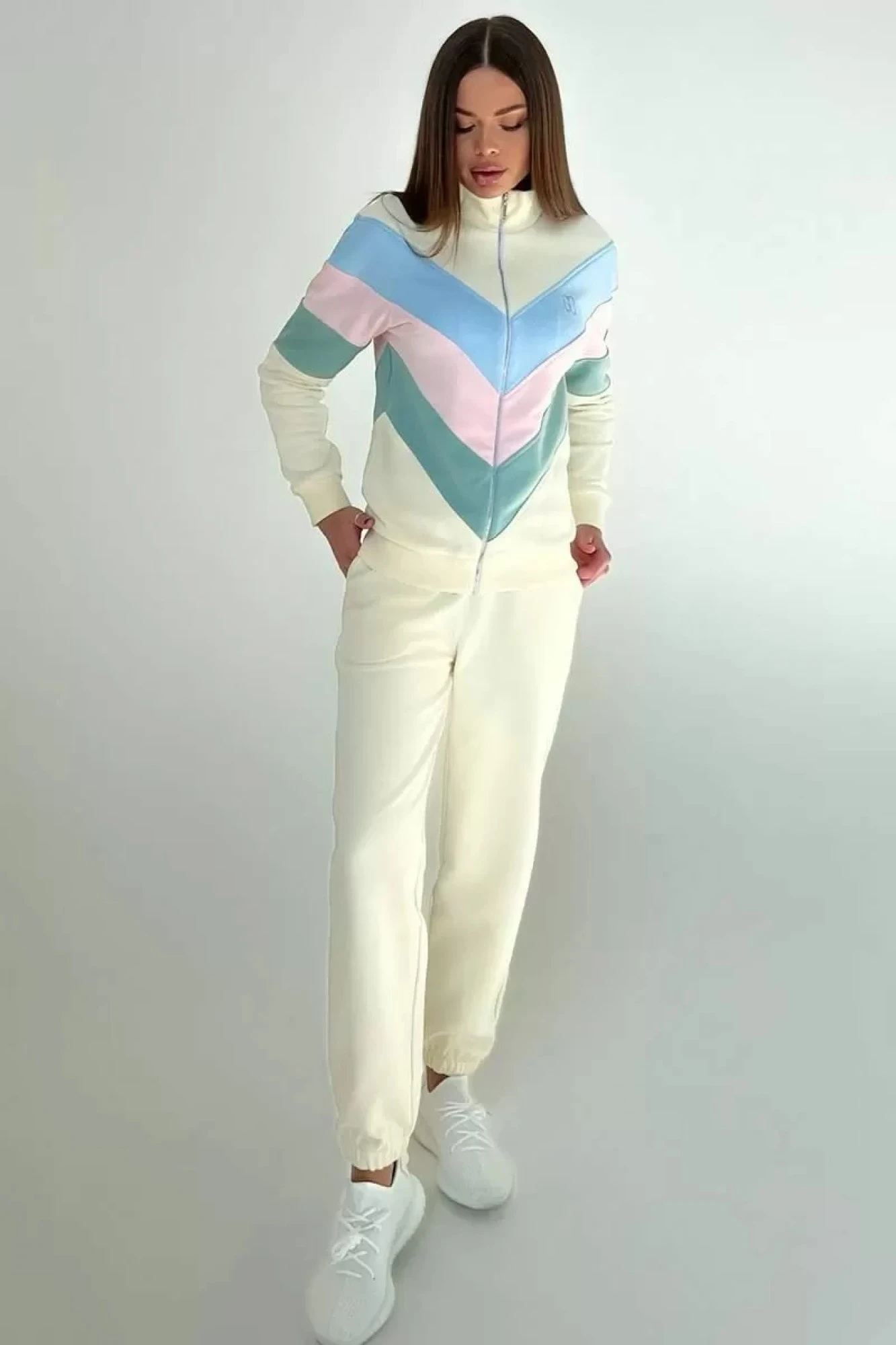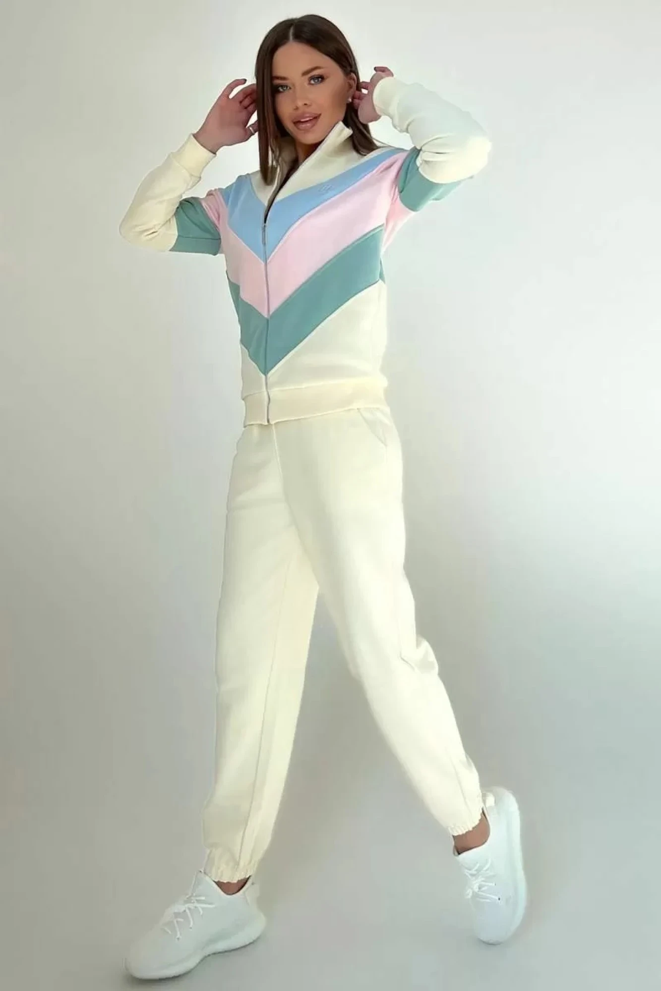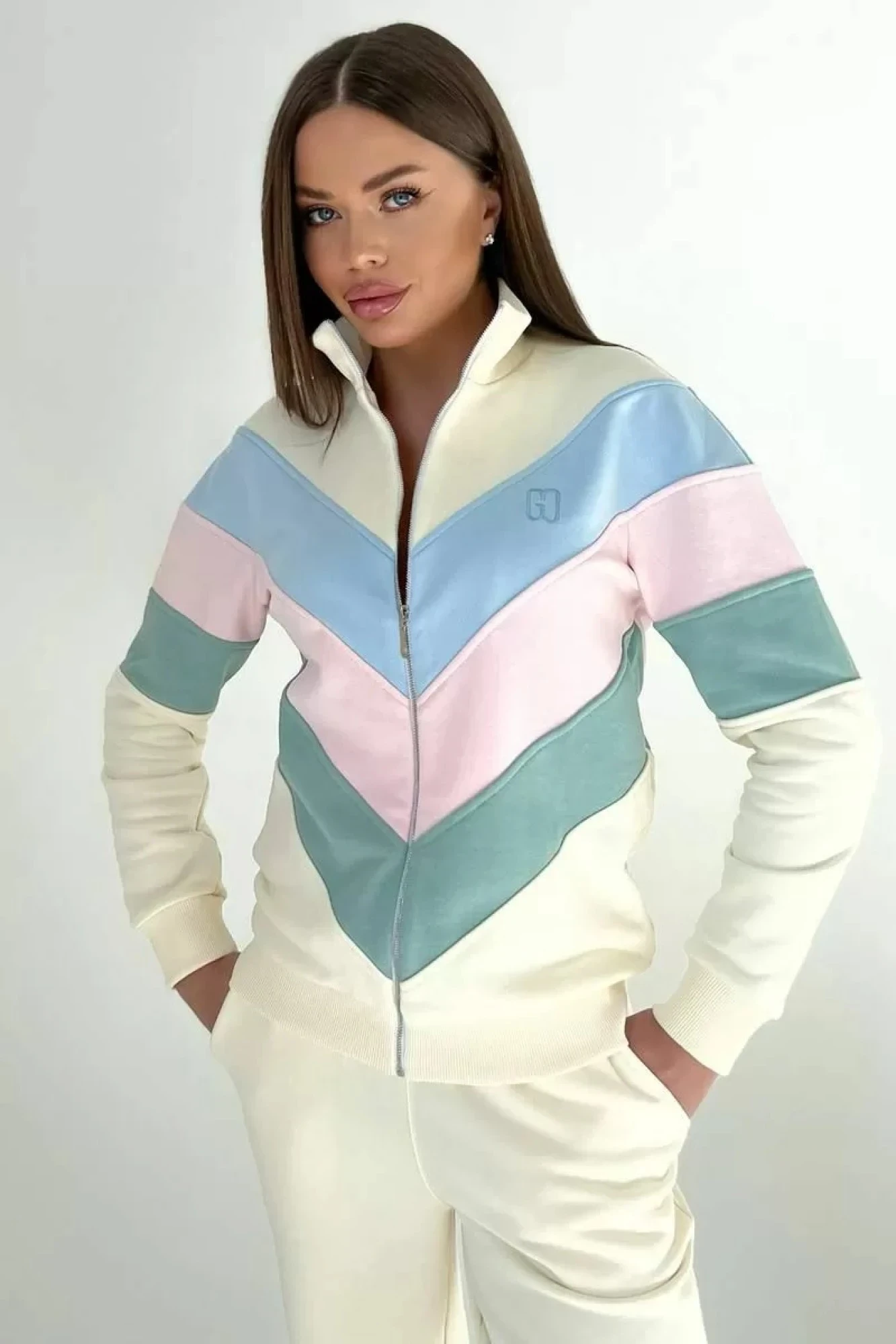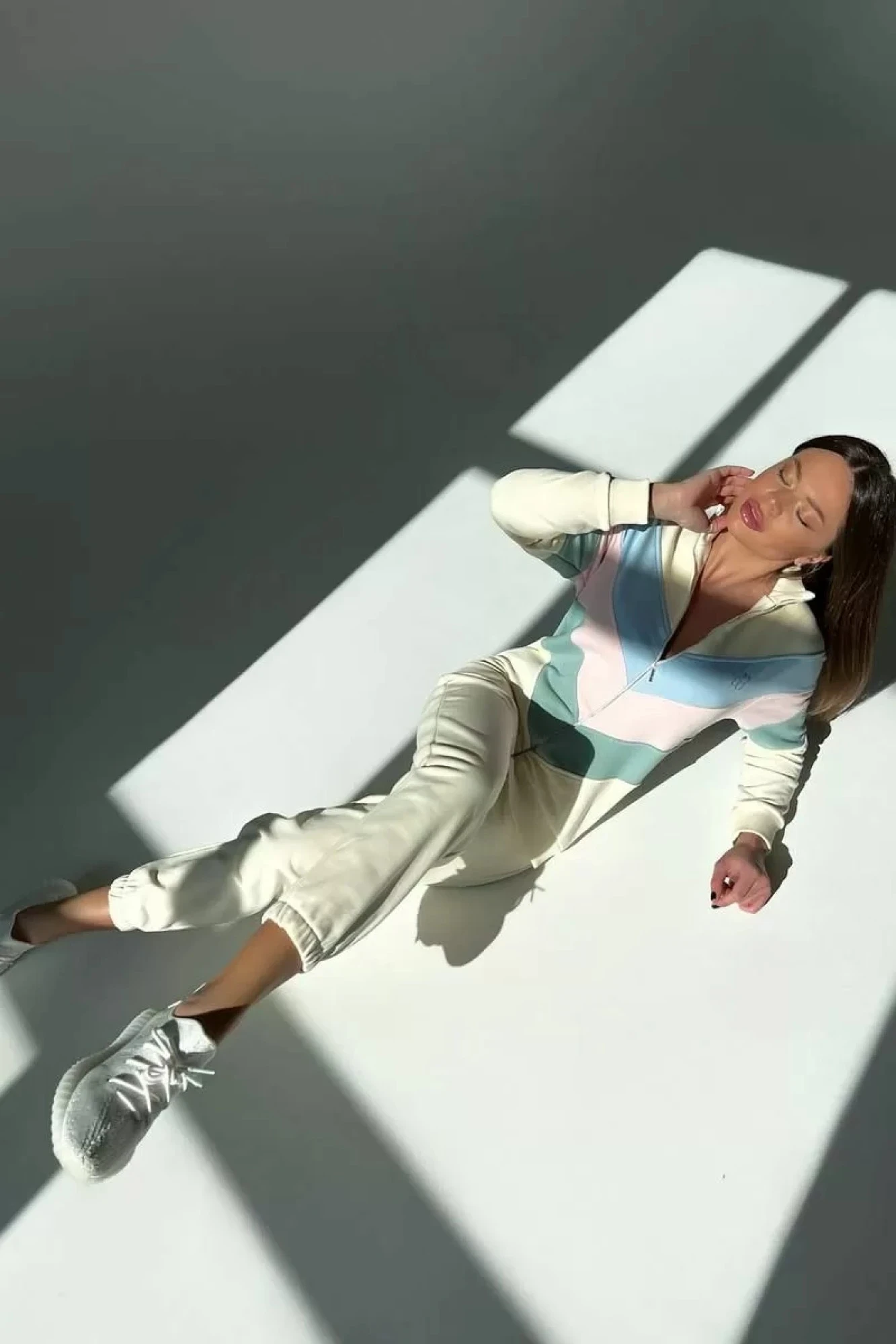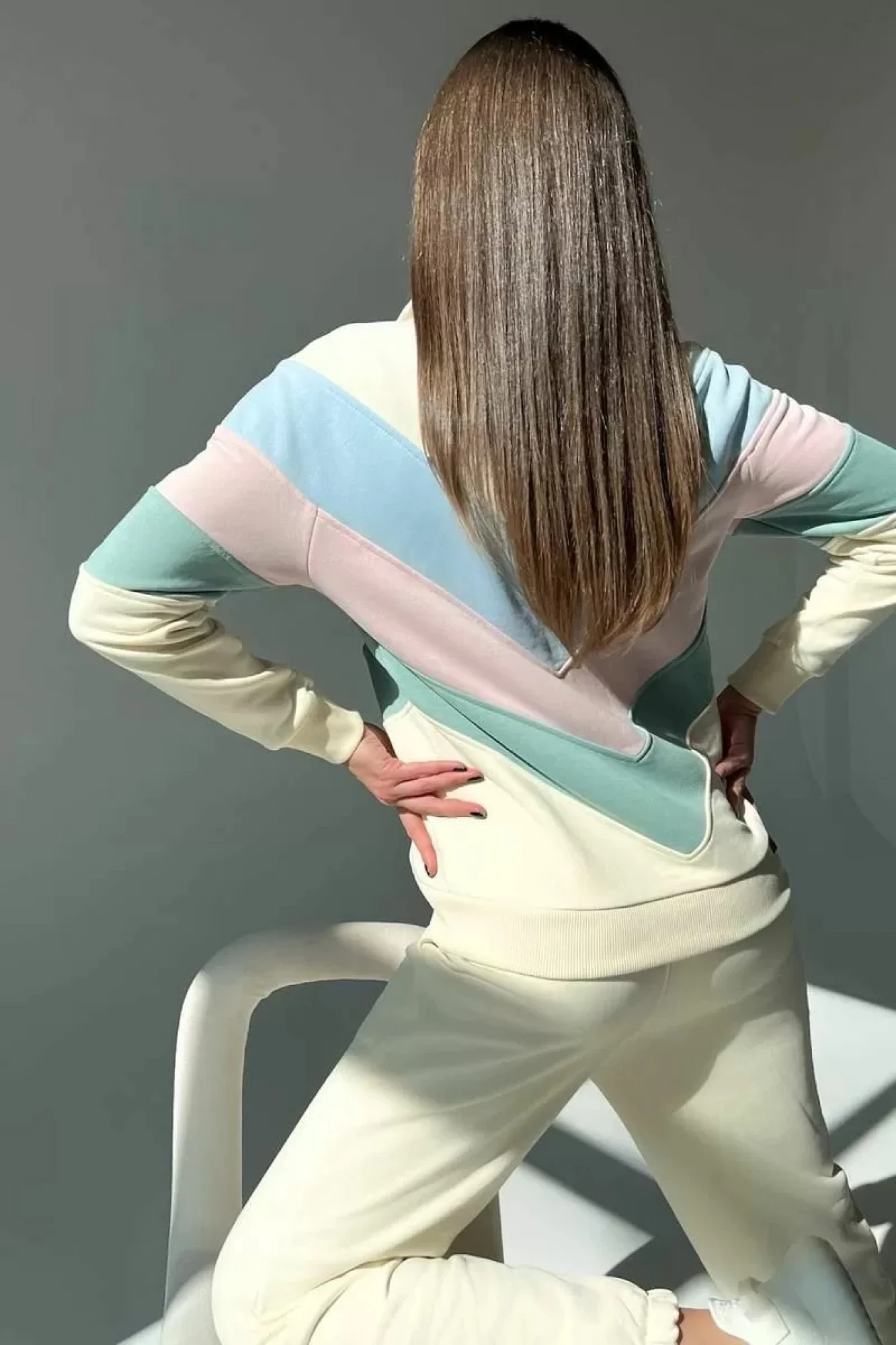 Джемпер с дизайнерскими, наклонными резами и на переде, и на спинке, выполненных из разных контрастных оттенков. Рукава визу имеют манжеты. Воротник-стойка, манжеты, низ джемпера выполнены из ткани-компаньена кошкорсе. На левом переде вышит логотип в цвет полоски. Брюки имеют современный крой и облегание, удобные карманы на передних половинка, притачной пояс и резинку внутри. Низ брюк присобран на резинку.