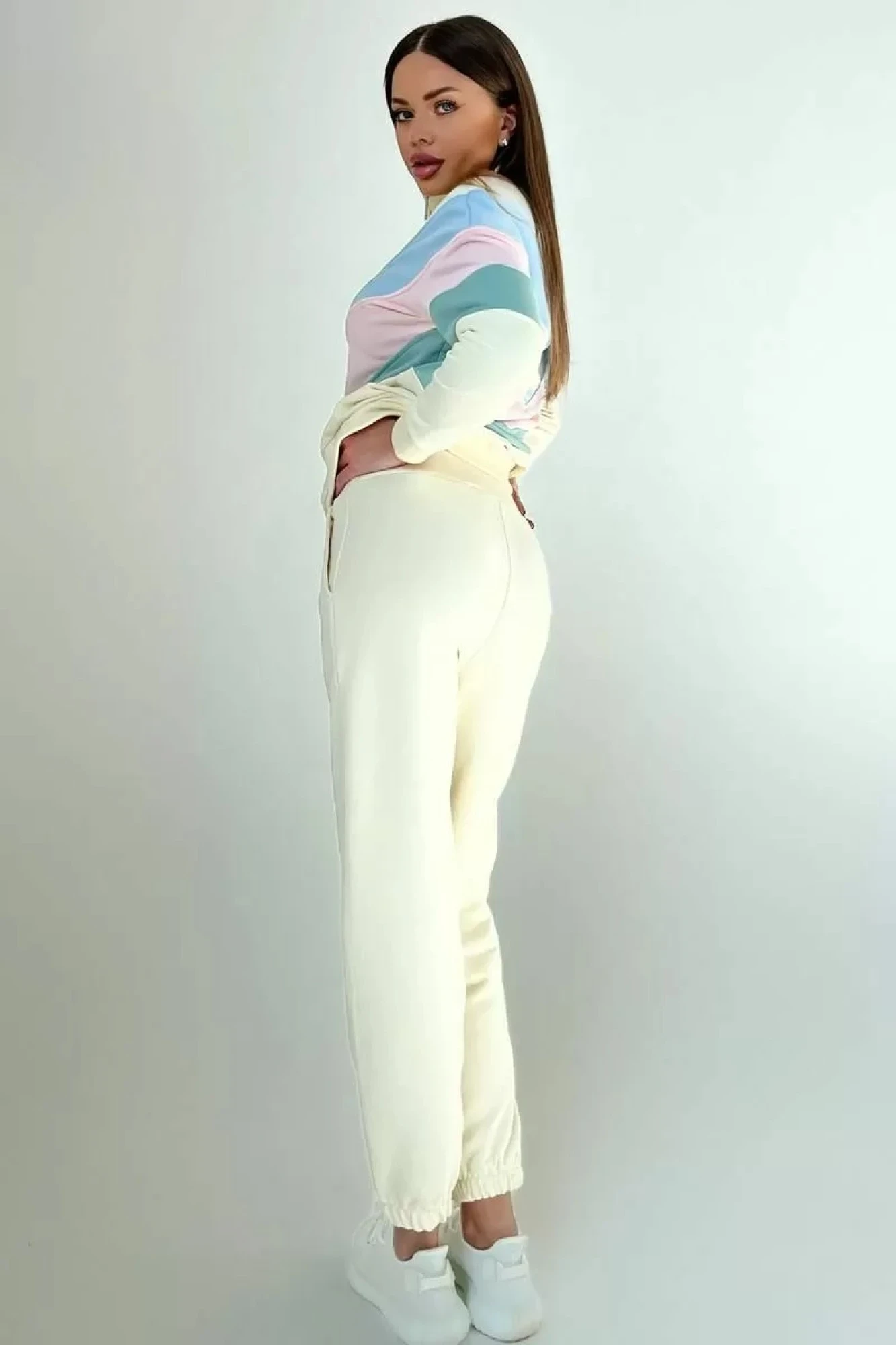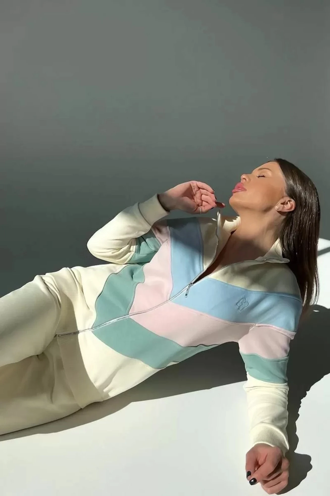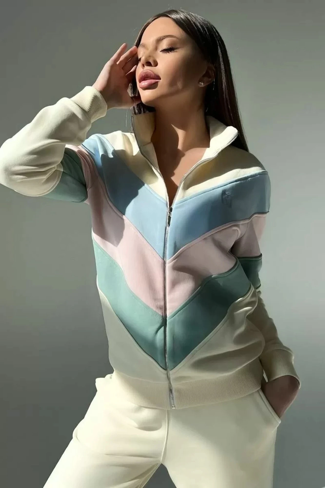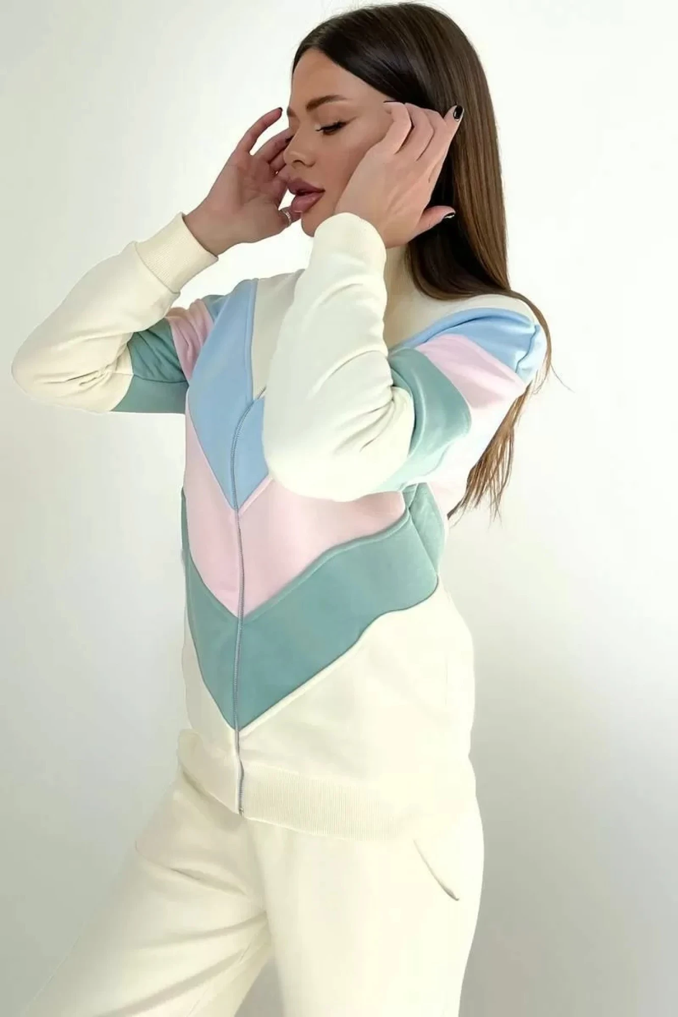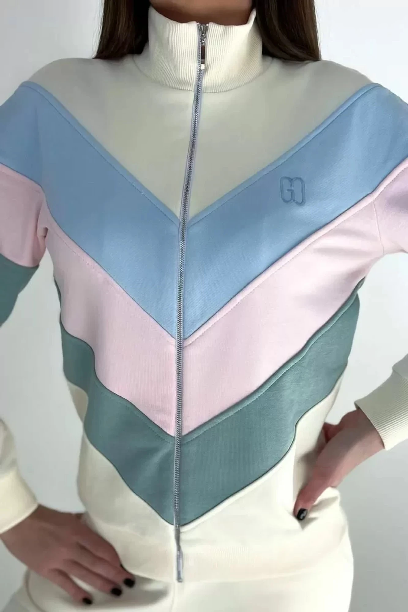 Джемпер с дизайнерскими, наклонными резами и на переде, и на спинке, выполненных из разных контрастных оттенков. Рукава визу имеют манжеты. Воротник-стойка, манжеты, низ джемпера выполнены из ткани-компаньена кошкорсе. На левом переде вышит логотип в цвет полоски. Брюки имеют современный крой и облегание, удобные карманы на передних половинка, притачной пояс и резинку внутри. Низ брюк присобран на резинку.